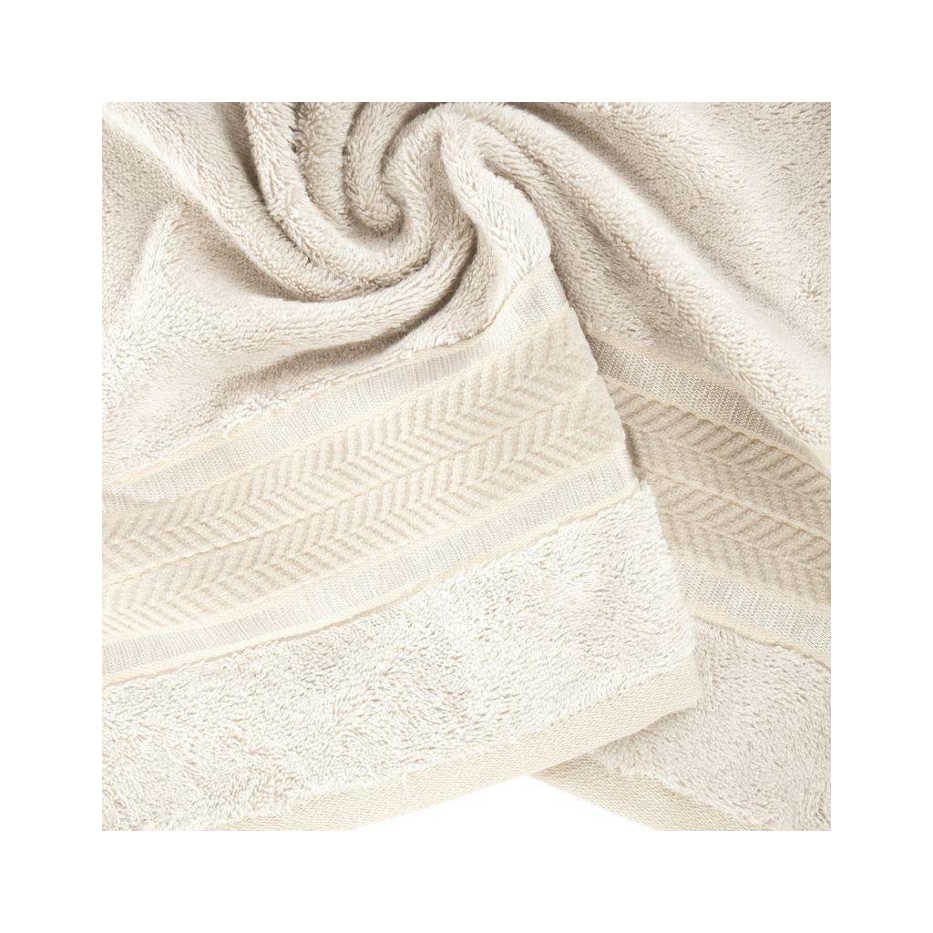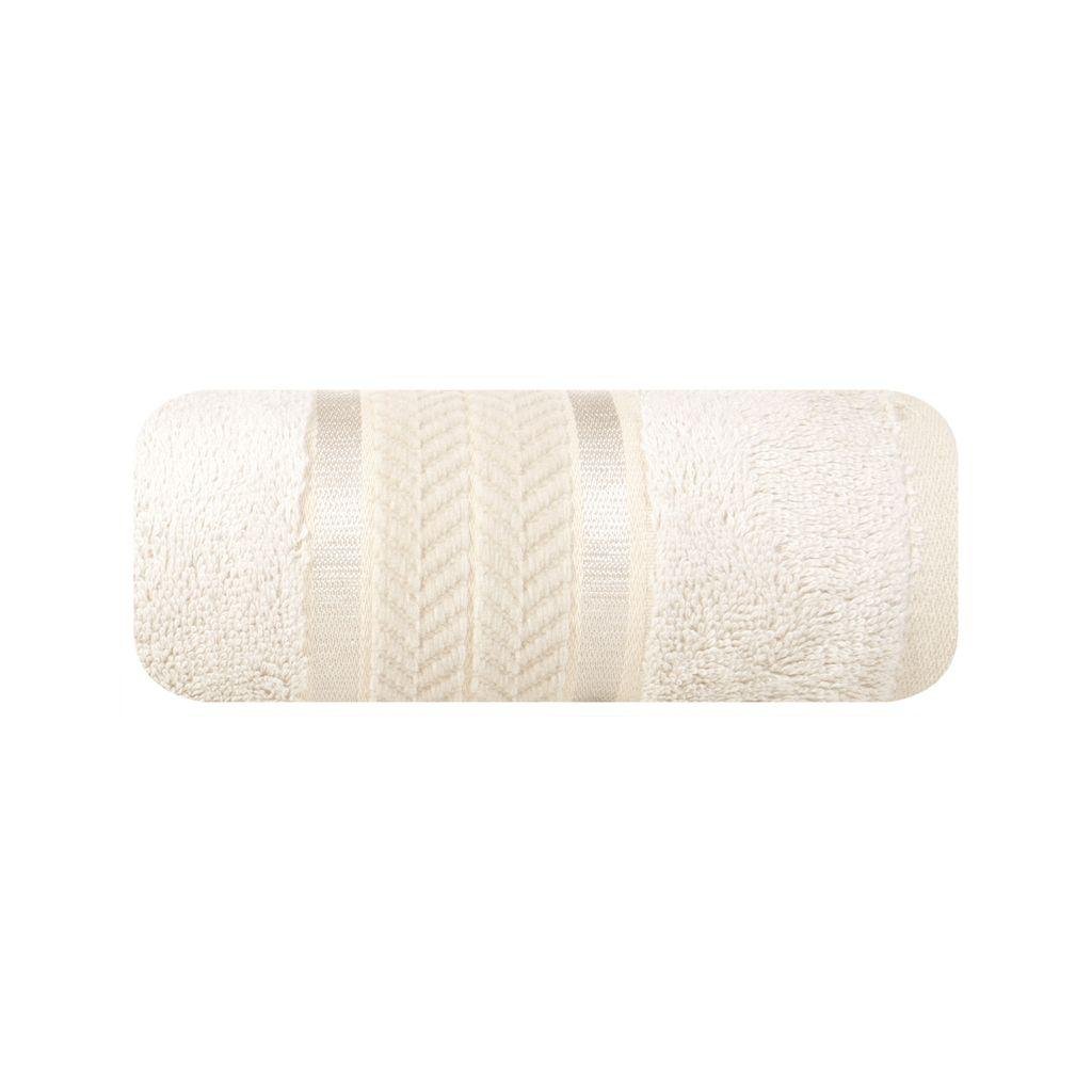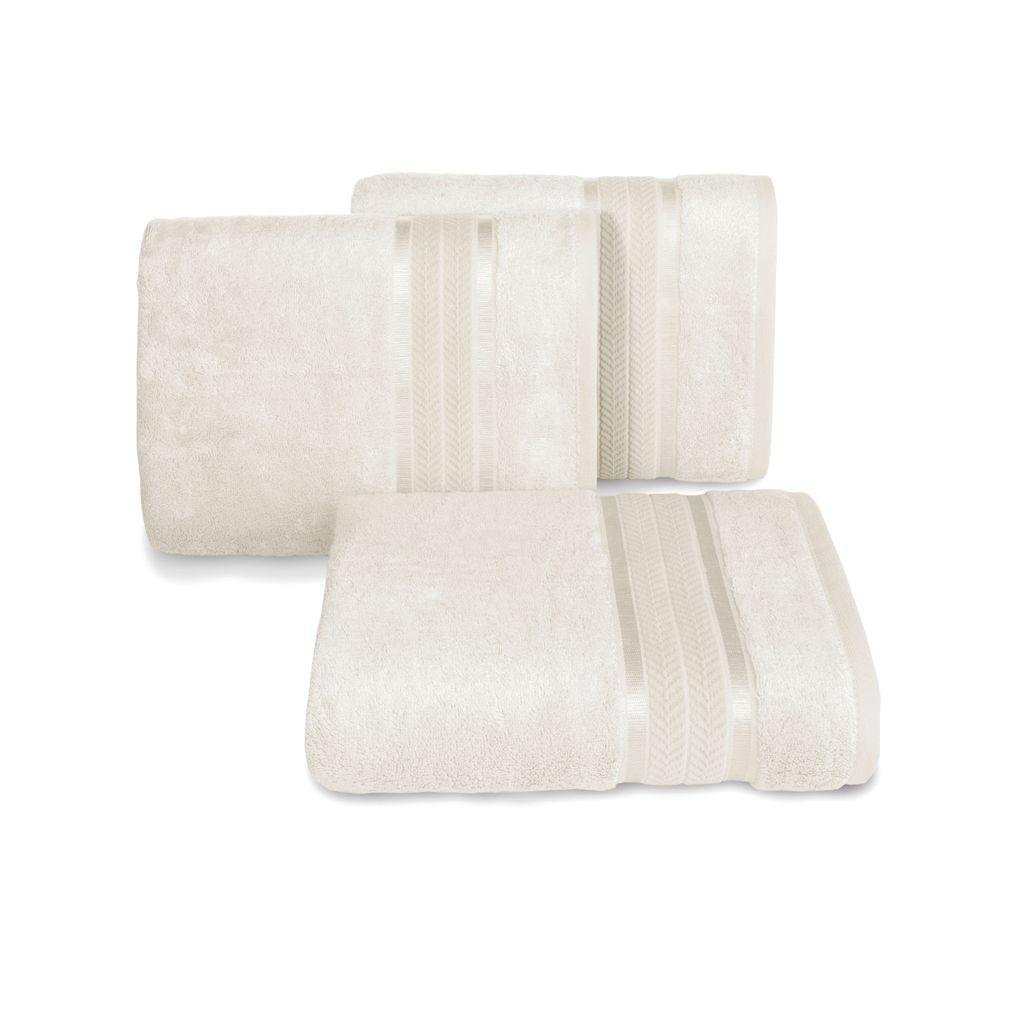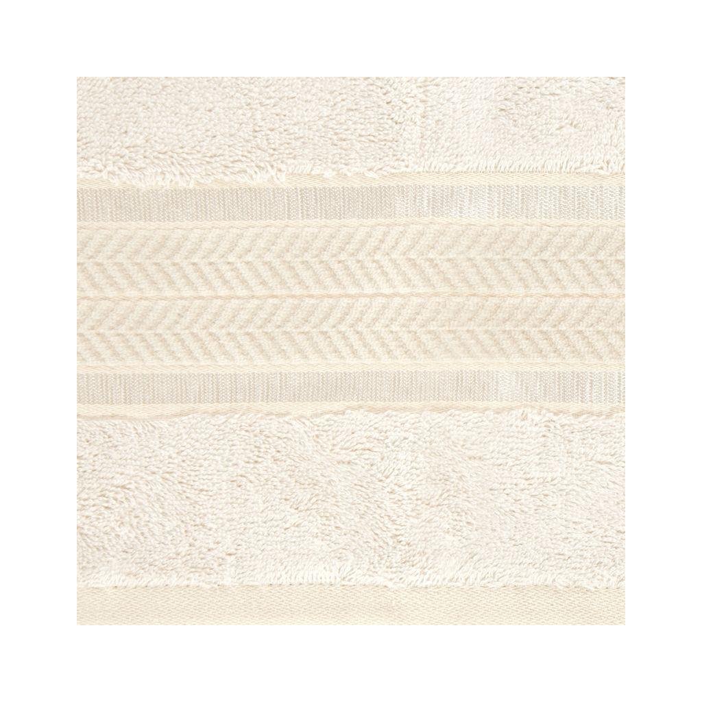 Elegantný bambusový froté uterák MIRO zo savej a nadýchanej látky so zaujímavým okrajom zdobeným lesklými pruhmi a jemným vzorom. Farba: krémová, Gramáž: 550 g/m2, Zloženie: 70% bambusové vlákno 30% bavlna.