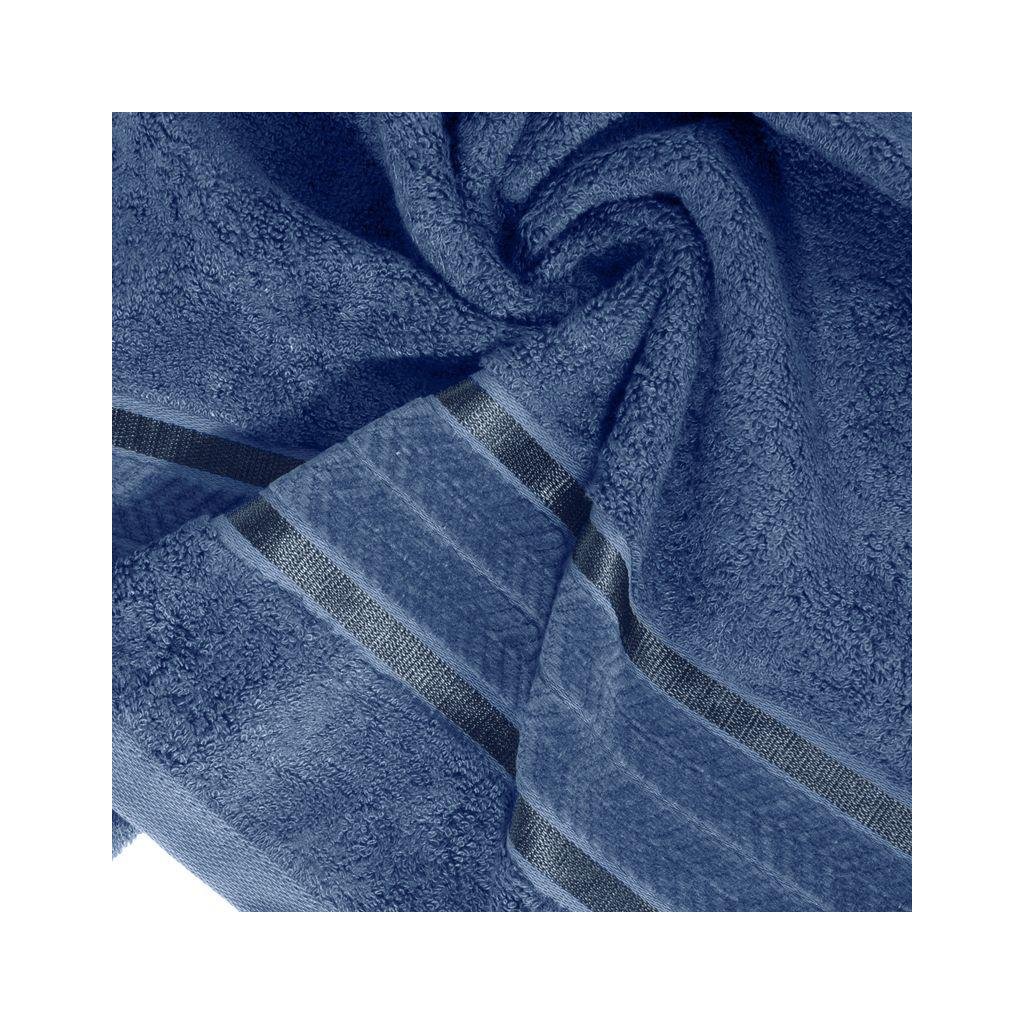 Elegantný bambusový froté uterák MIRO zo savej a nadýchanej látky so zaujímavým okrajom zdobeným lesklými pruhmi a jemným vzorom. Farba: svetlomodrá, Gramáž: 550 g/m2, Zloženie: 70% bambusové vlákno 30% bavlna.