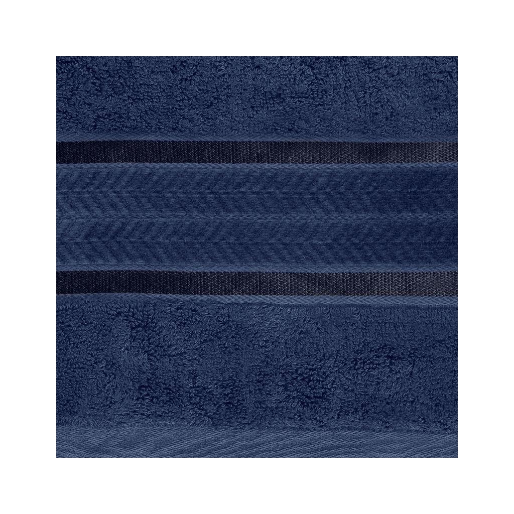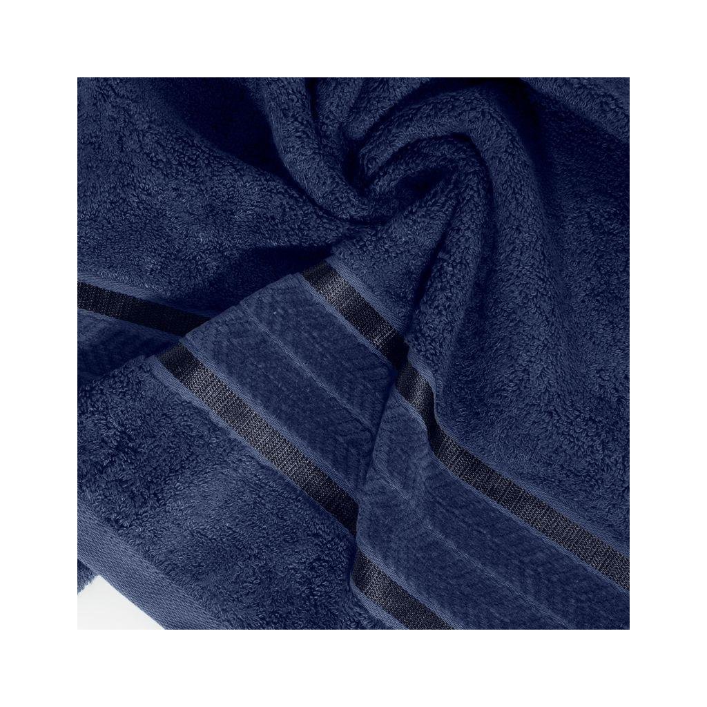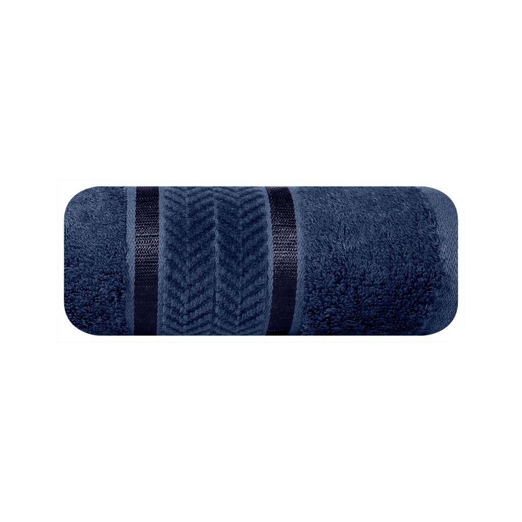 Elegantný bambusový froté uterák MIRO zo savej a nadýchanej látky so zaujímavým okrajom zdobeným lesklými pruhmi a jemným vzorom. Farba: tmavomodrá, Gramáž: 550 g/m2, Zloženie: 70% bambusové vlákno 30% bavlna.