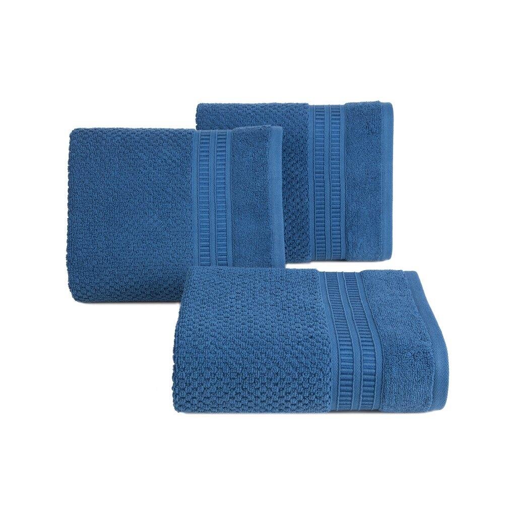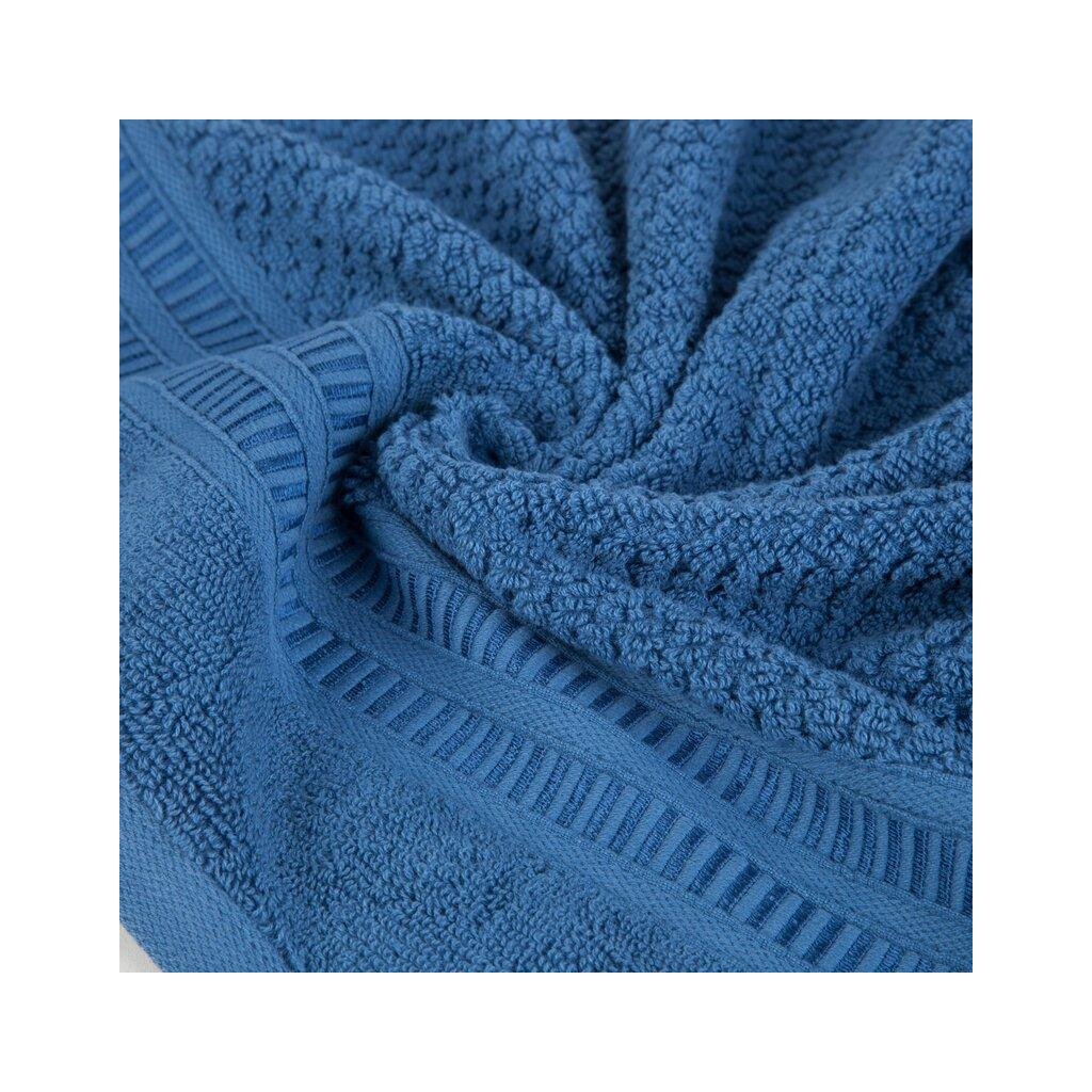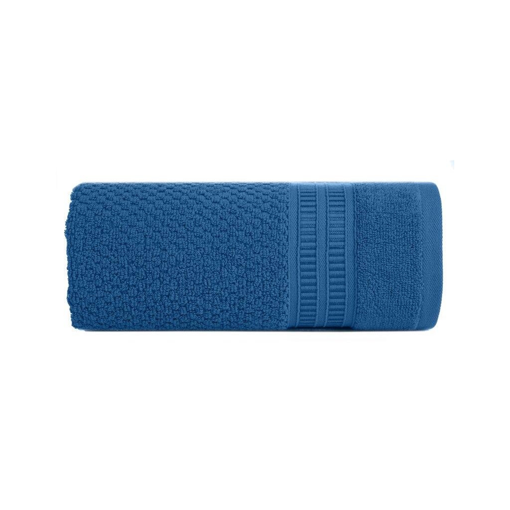 Bavlnený uterák ROSITA s ryžovou štruktúrou a žakárovou bordúrou s geometrickým vzorom, ktorý sa hodí do každej kúpeľne, či už je v modernom alebo tradičnom štýle. Farba: modrá, gramáž: 500 g/m2, Zloženie: 99% bavlna, 1% viskóza (ozdobná časť)