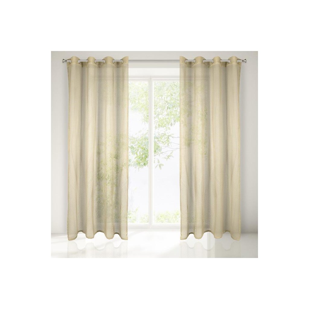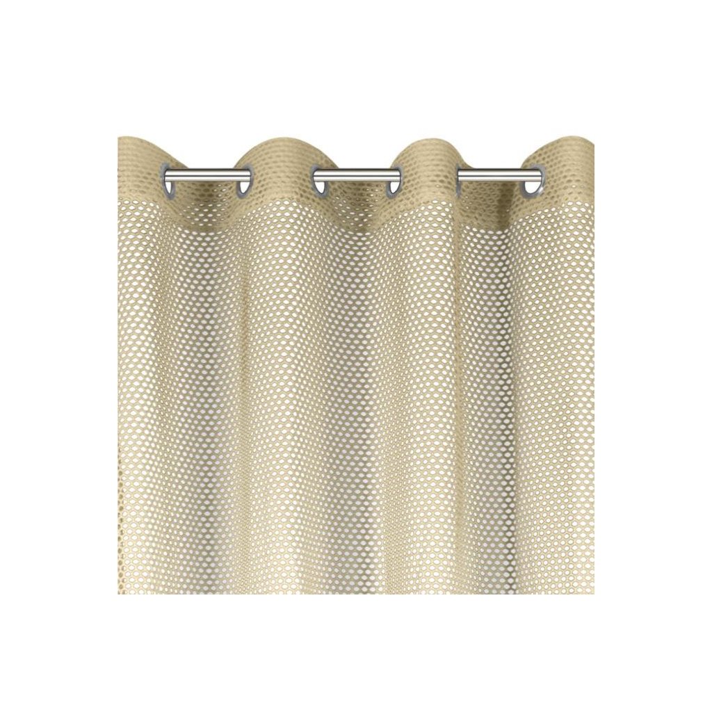 Jednofarebná sieťovaná záclona béžovej farby s hrubou dierovanou sieťkou. Jemná látka dovnútra prepúšťa veľa svetla. ľahké žehlenie. Šírka 140, dĺžka 250 cm.
