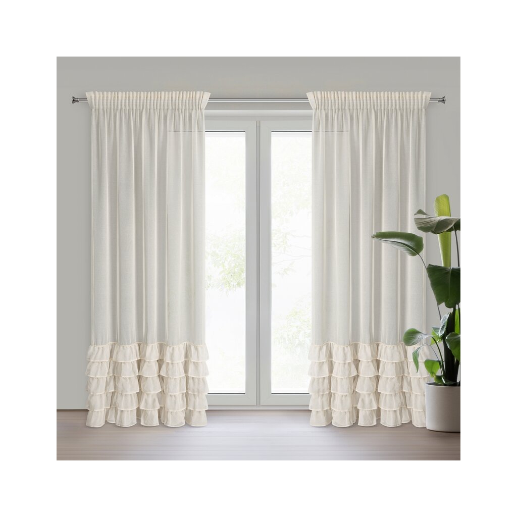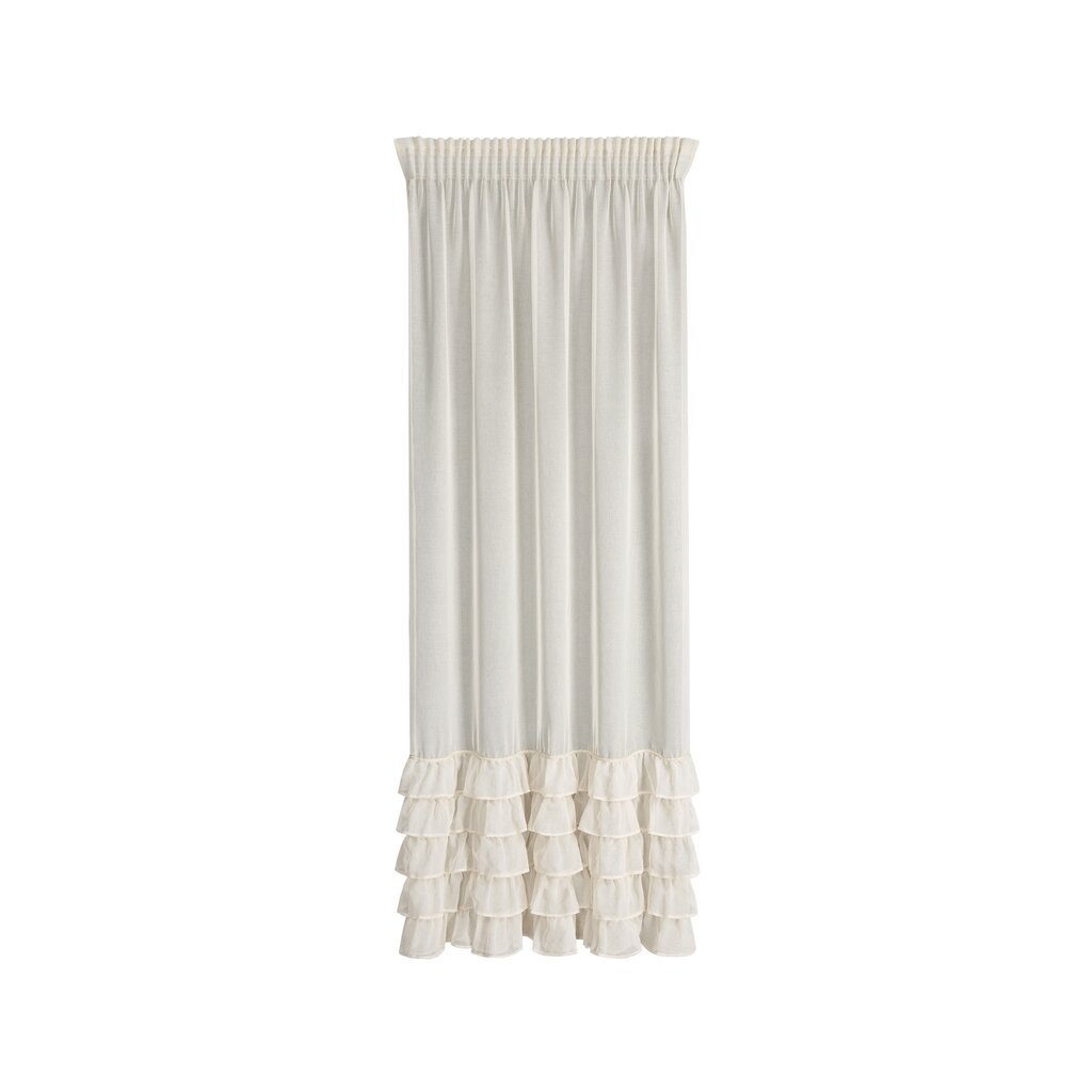 Romantické volány v spodnej časti záclony pôsobia ako efektný dekoratívny detail, ktorý dodáva interiéru šarm a eleganciu. Sú oddelené jemným pásikom so štrasovým zdobením, ktorý vnáša do priestoru luxusný nádych a decentný lesk. Vďaka tomu sa záclona stáva nielen praktickým doplnkom, ale aj výraznou ozdobou každého okna.