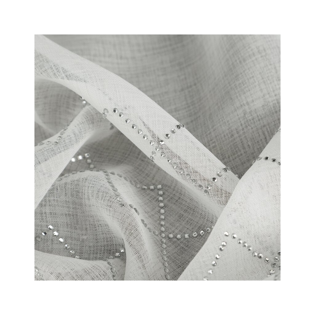 Horná časť záclony je ozdobená pásom lesklých kryštálikov usporiadaných do jemného geometrického vzoru. Tento detail dodáva záclone jedinečný šarm, eleganciu a nádych luxusu, vďaka čomu sa stáva nielen praktickým doplnkom, ale aj výraznou ozdobou každého interiéru.