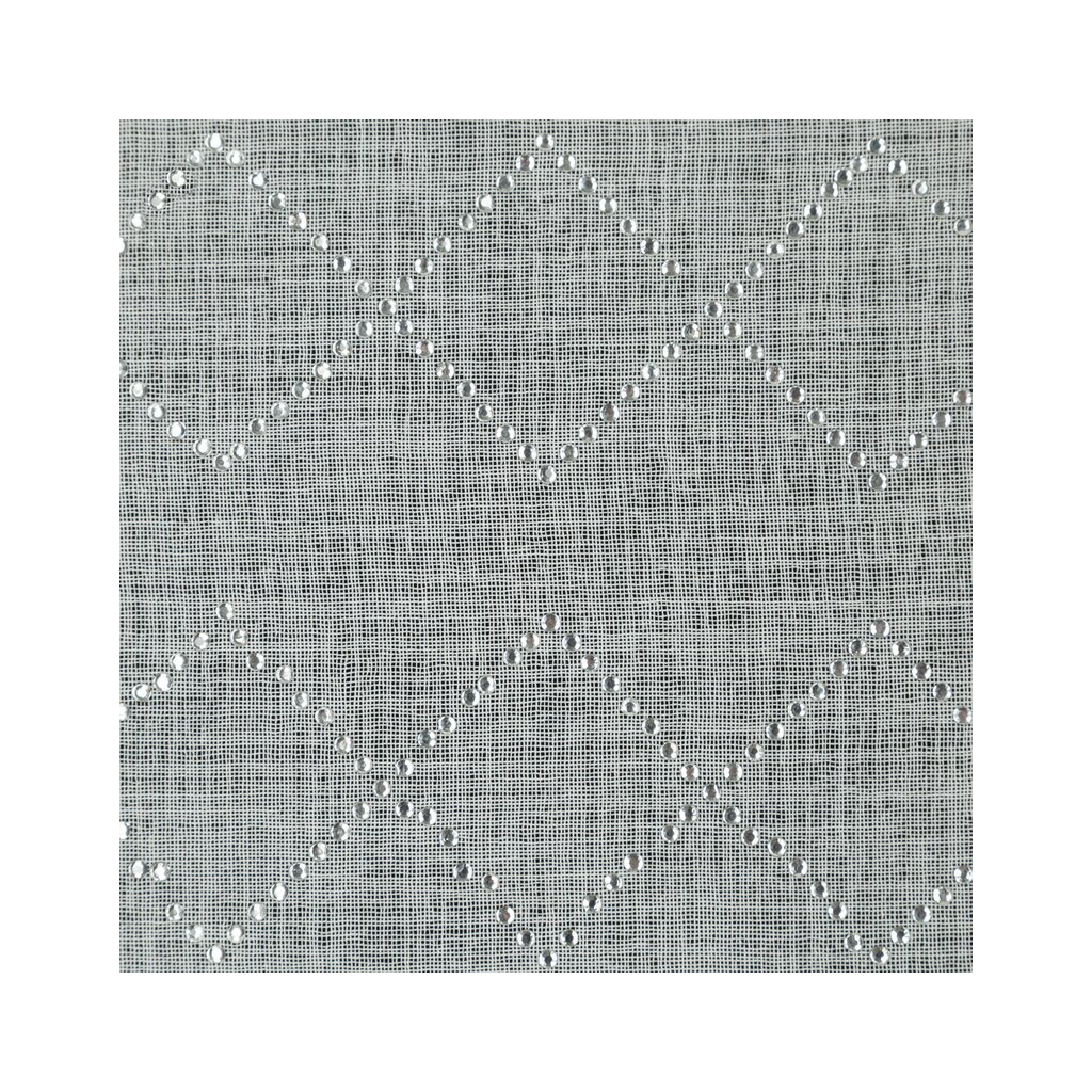 Horná časť záclony je ozdobená pásom lesklých kryštálikov usporiadaných do jemného geometrického vzoru. Tento detail dodáva záclone jedinečný šarm, eleganciu a nádych luxusu, vďaka čomu sa stáva nielen praktickým doplnkom, ale aj výraznou ozdobou každého interiéru.