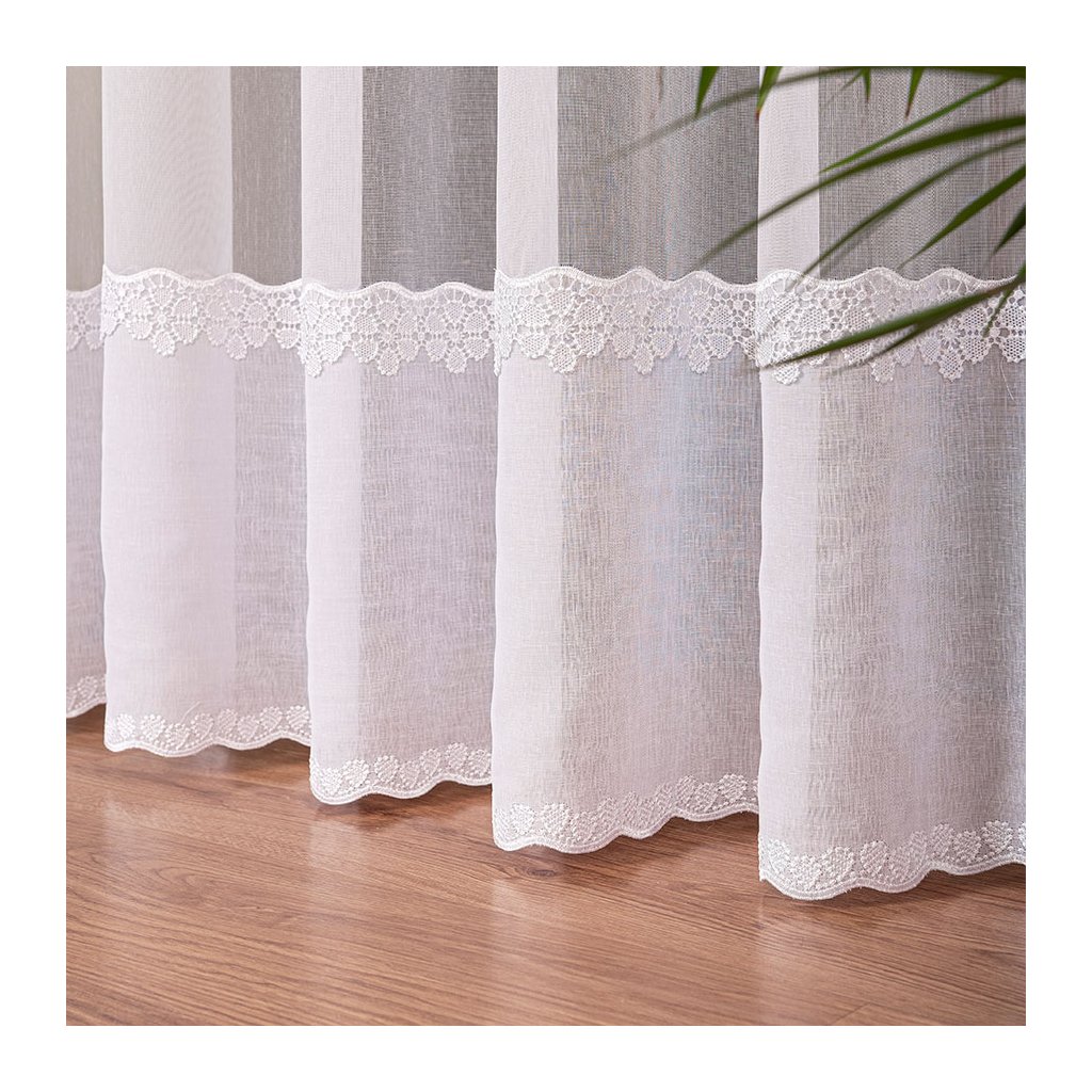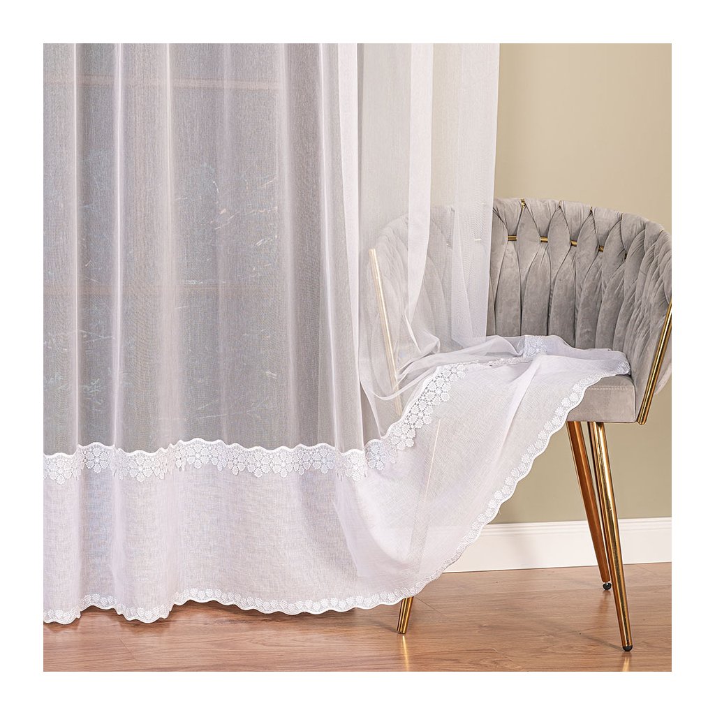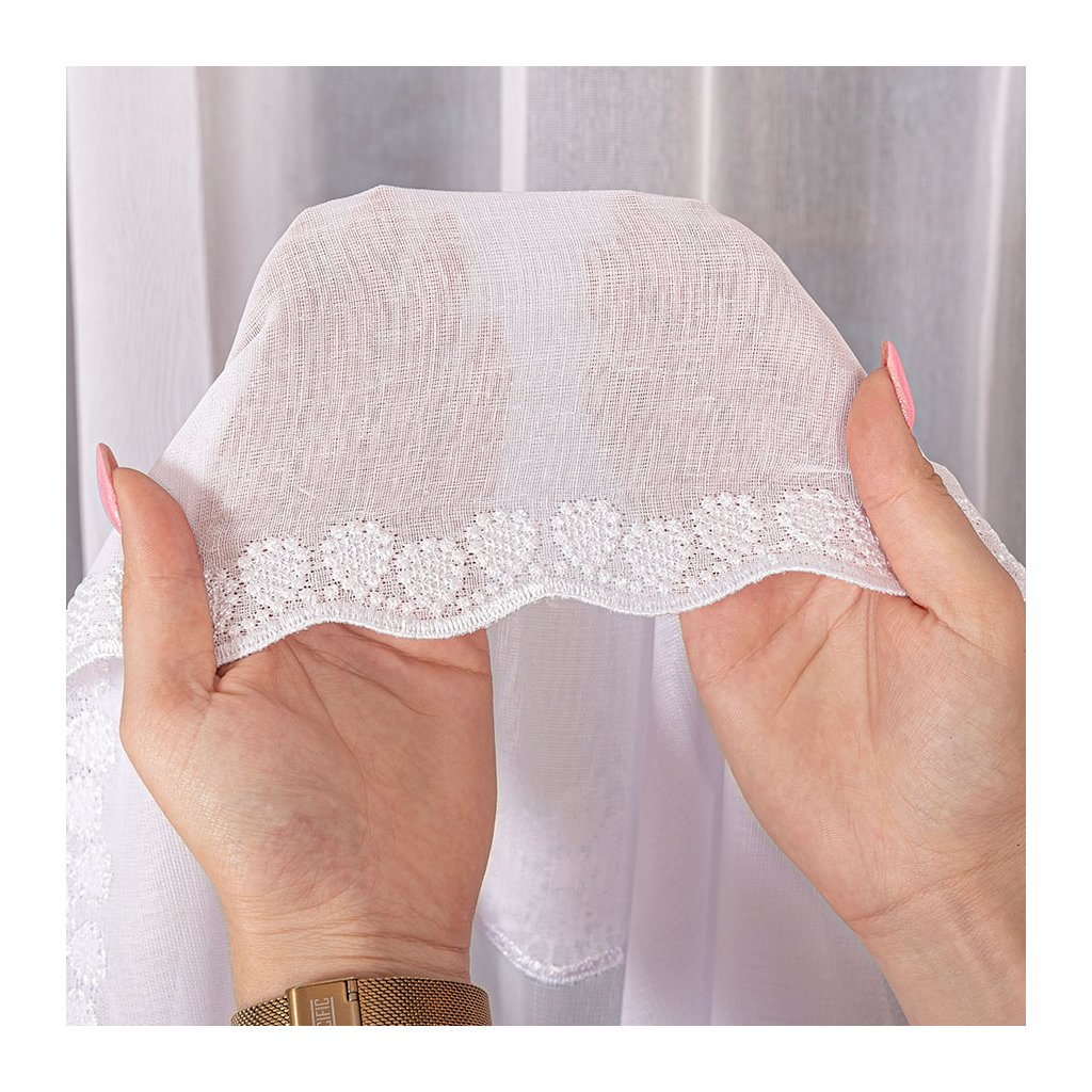 Záclona ZORA s jemným pásovým dizajnom a elegantnou výšivkou v spodnej časti je ideálnou voľbou pre tých, ktorí túžia po spojení čistoty, elegancie a jemného zdobenia. Základom záclony je priesvitný biely tyl, ktorý pôsobí vzdušne a prirodzene prepúšťa svetlo do miestnosti. Spodný okraj zdobí výrazná vyšívaná bordúra s kvetinovým motívom, ktorá dodáva celej záclone romantický a premyslený vzhľad.