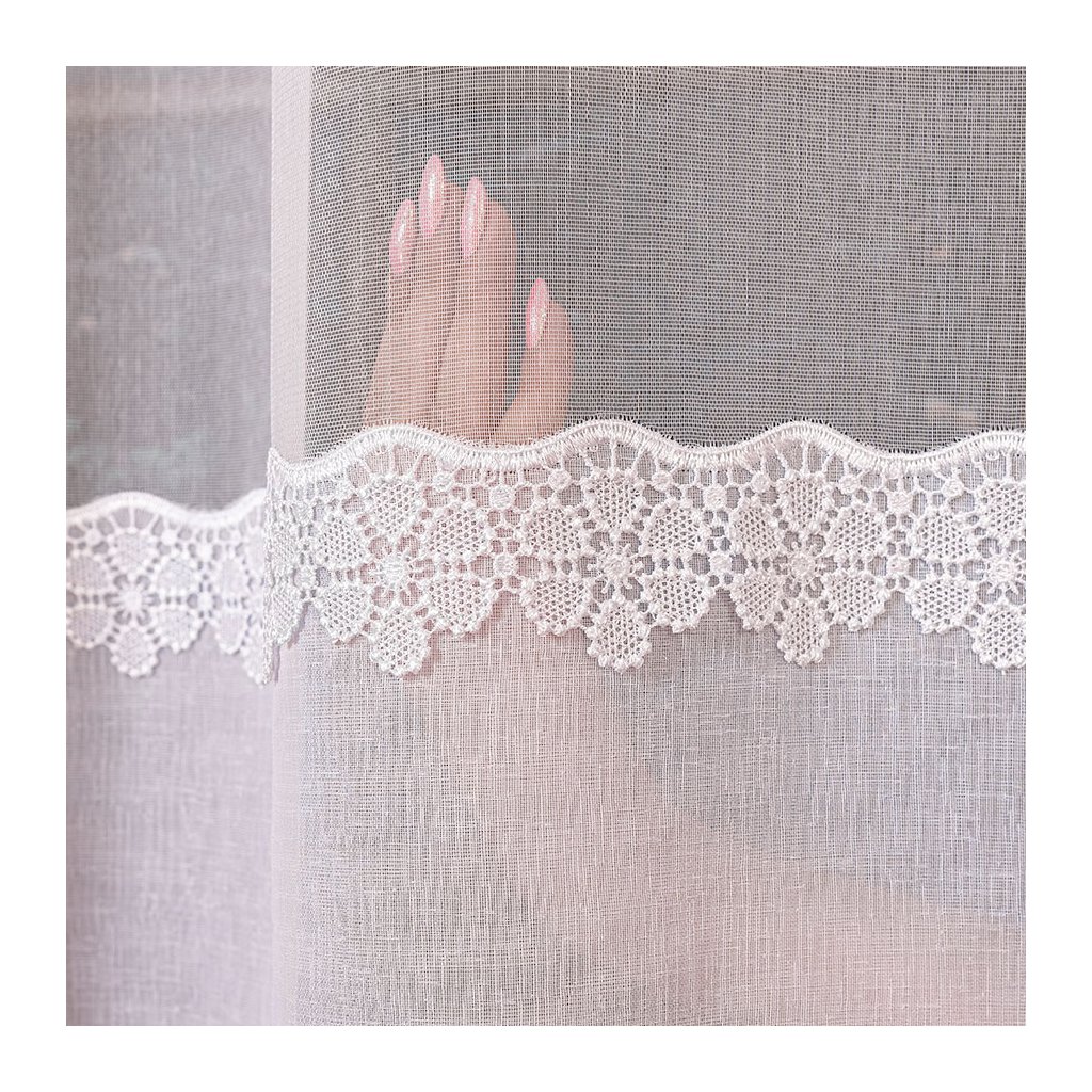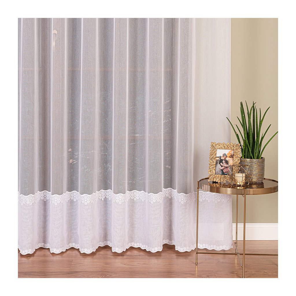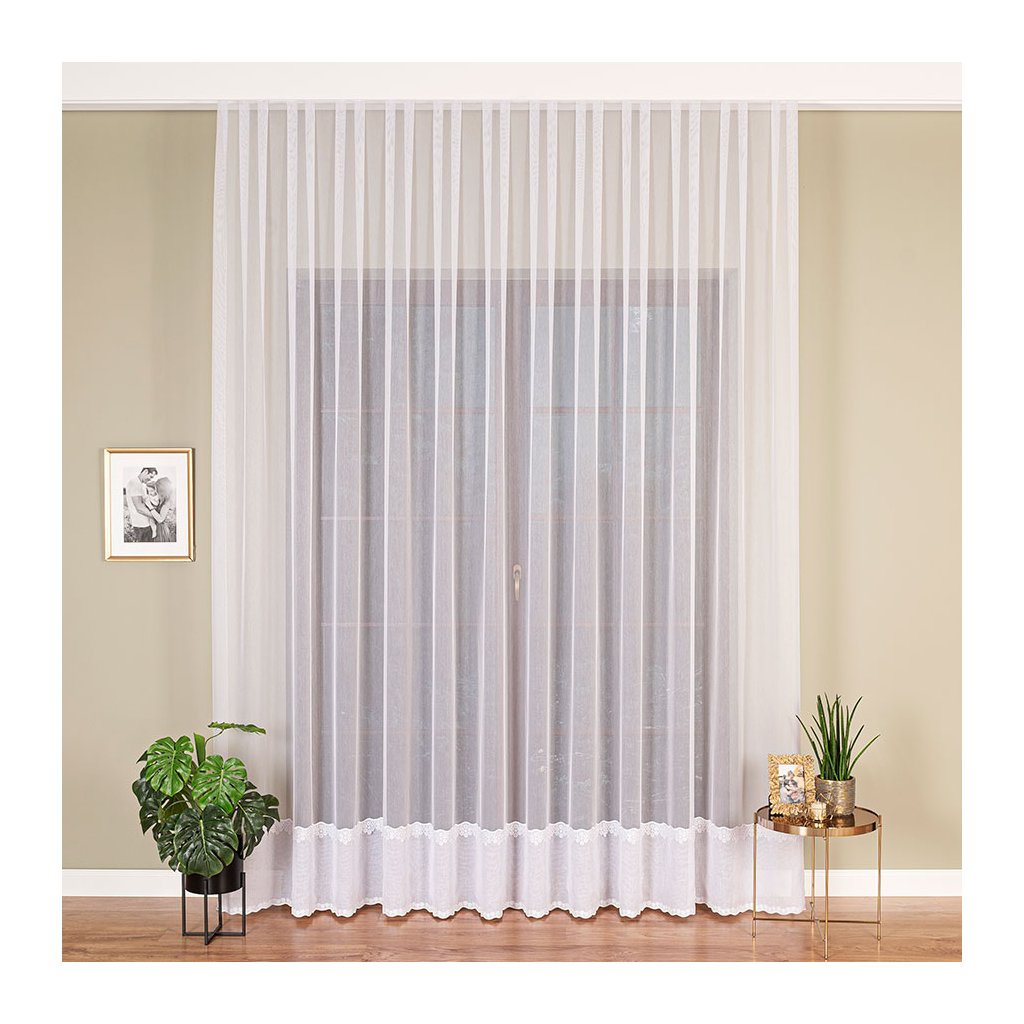Záclona ZORA s jemným pásovým dizajnom a elegantnou výšivkou v spodnej časti je ideálnou voľbou pre tých, ktorí túžia po spojení čistoty, elegancie a jemného zdobenia. Základom záclony je priesvitný biely tyl, ktorý pôsobí vzdušne a prirodzene prepúšťa svetlo do miestnosti. Spodný okraj zdobí výrazná vyšívaná bordúra s kvetinovým motívom, ktorá dodáva celej záclone romantický a premyslený vzhľad.