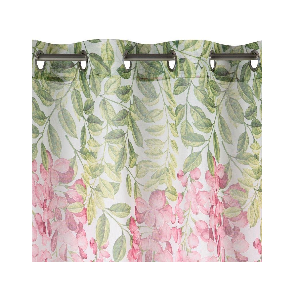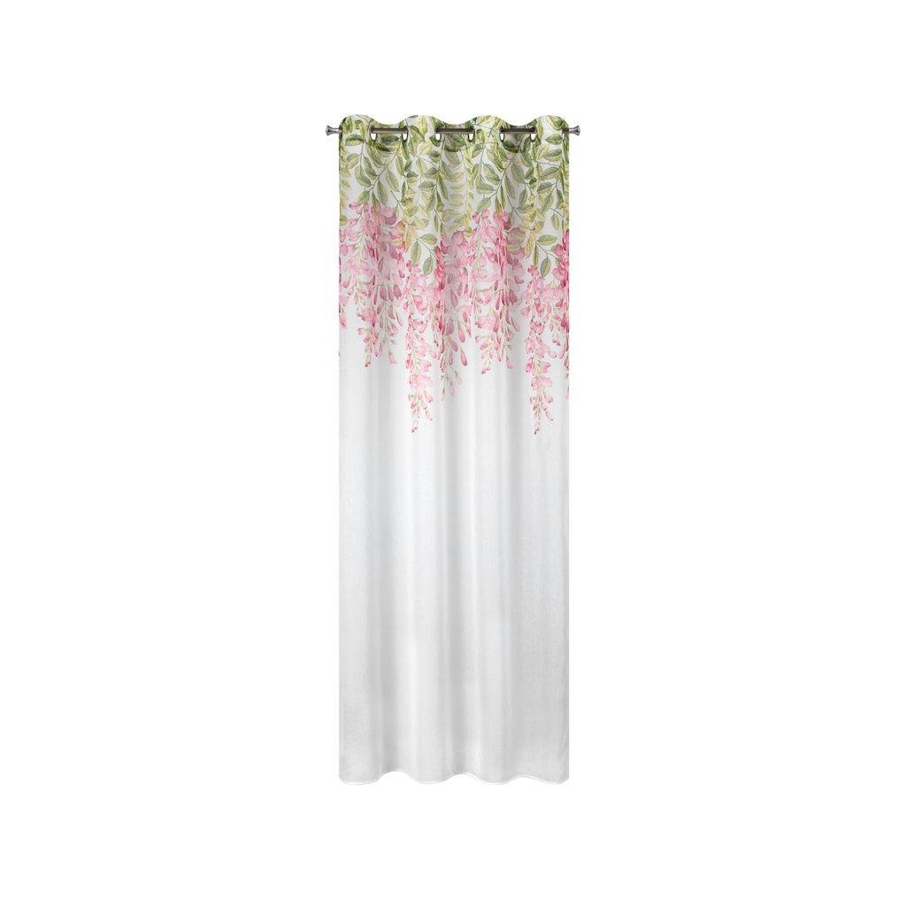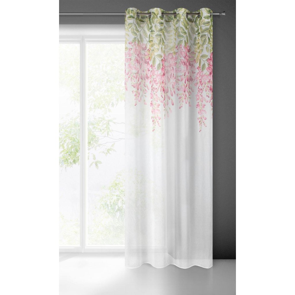 Biela záclona s kvetinovým vzorom vo vrchnej časti záclony. Praktické zavesenie na krúžky. Šírka 140 cm, dĺžka: 250 cm. Farba vzoru: ružovo zelená.