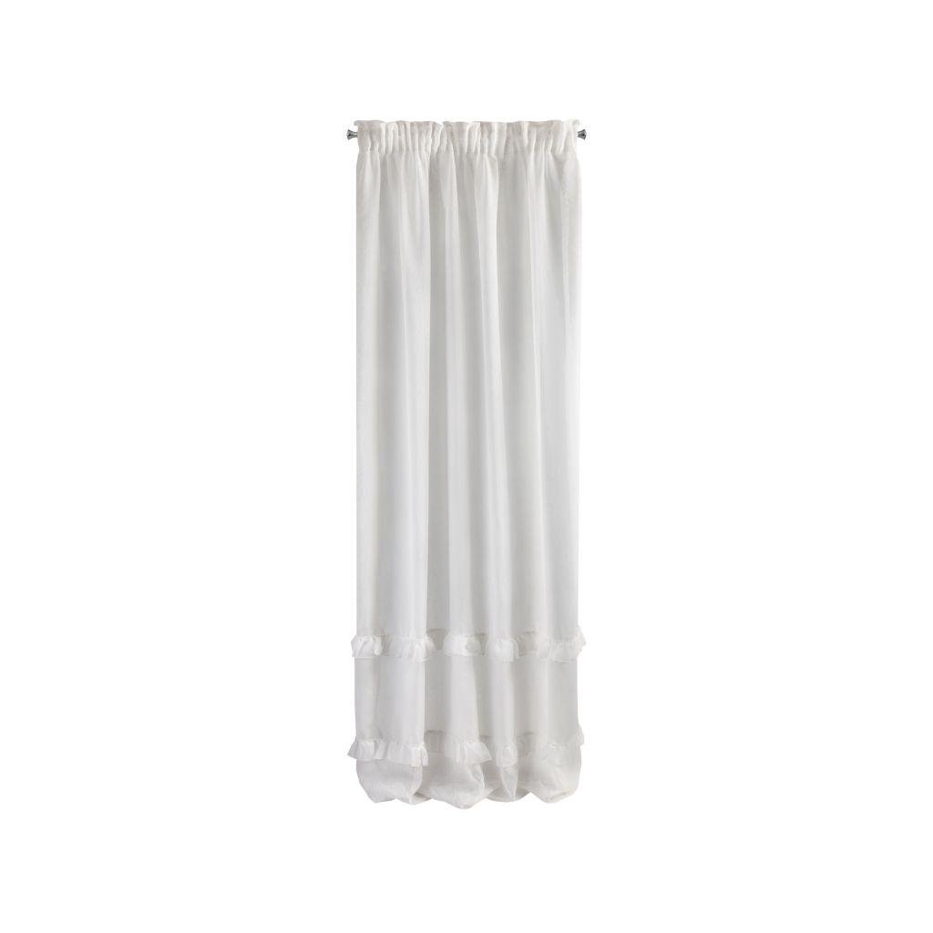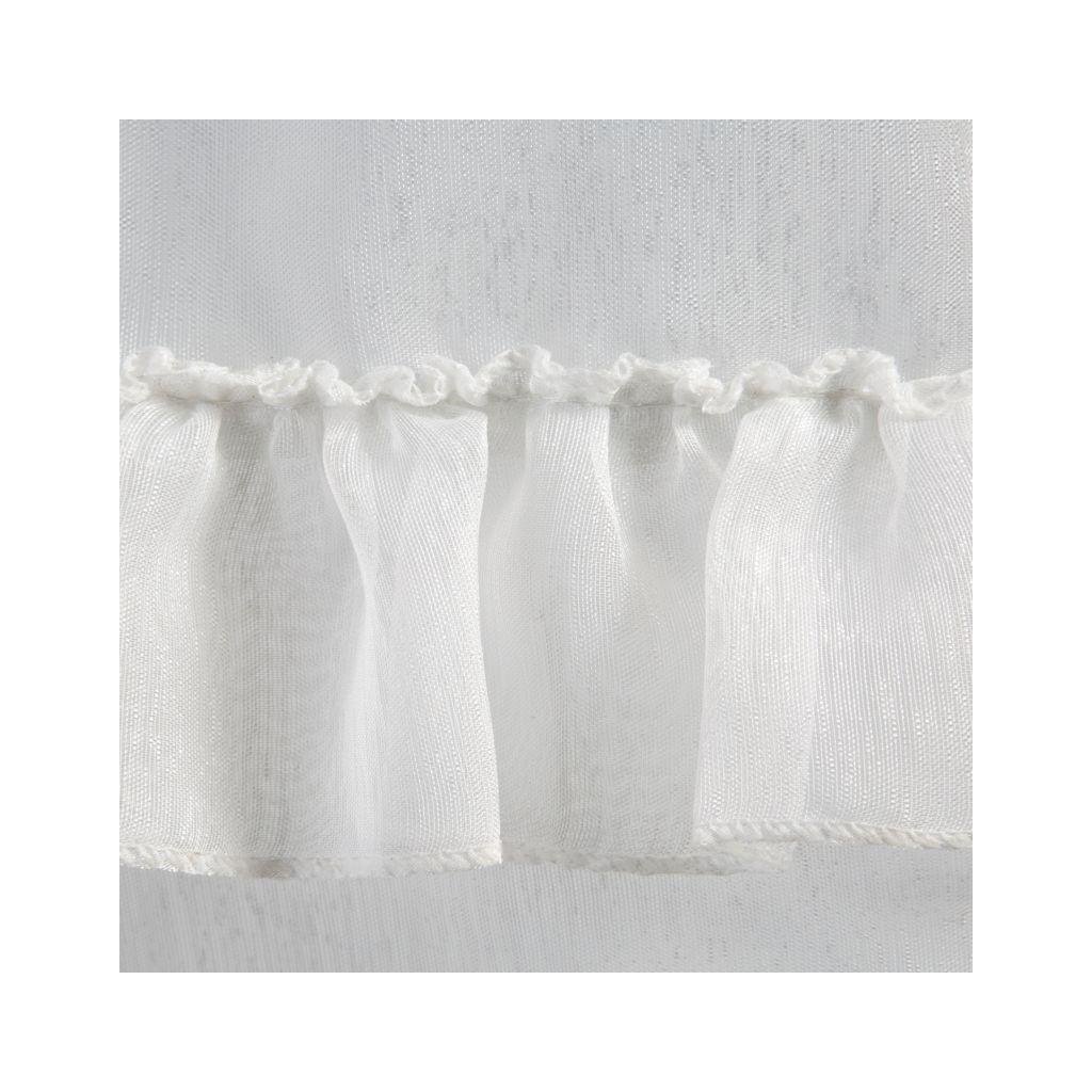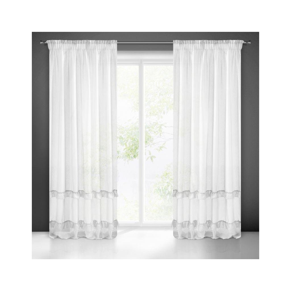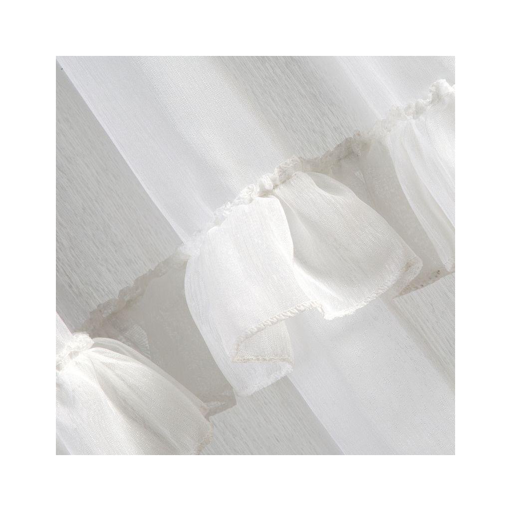Ľahká záclona bielej farby vyrobená z jemnej látky so štruktúrou dažďa a s tromi volánmi v spodnej časti. Romantická dekorácia. Šírka: 140 cm, dĺžka: 270 cm. Zloženie: 100% polyester. Ľahké žehlenie a pranie. Praktické zavesenie na riasiacej páske.