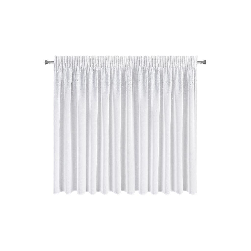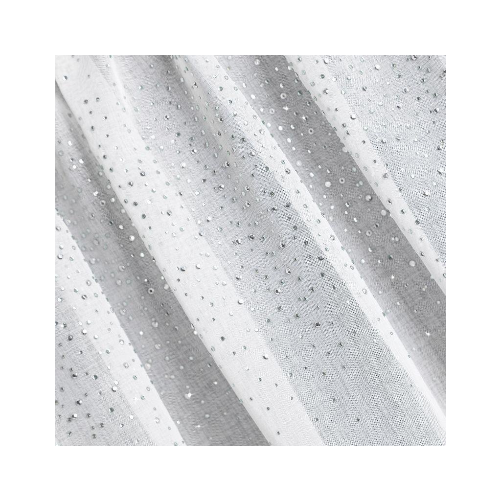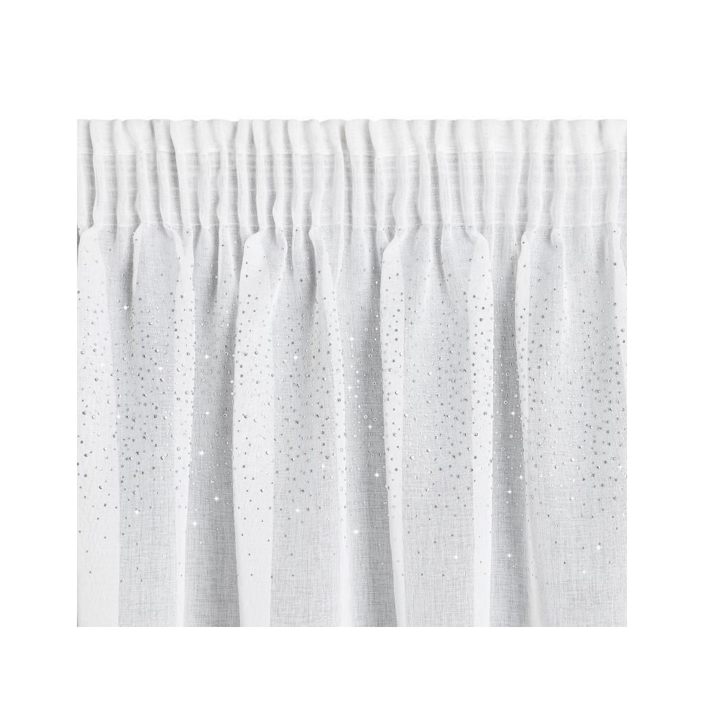 Záclona bielej farby z hladkého etamínu zdobená v hornej časti aplikáciou trblietavých strieborných kamienkov. Šírka: 400 cm, dĺžka: 145 cm. Zloženie: 100% polyester. Ľahké žehlenie a pranie. Praktické zavesenie na riasiacej páske.