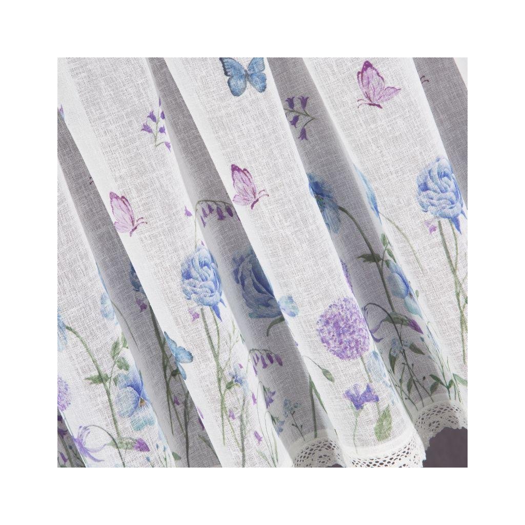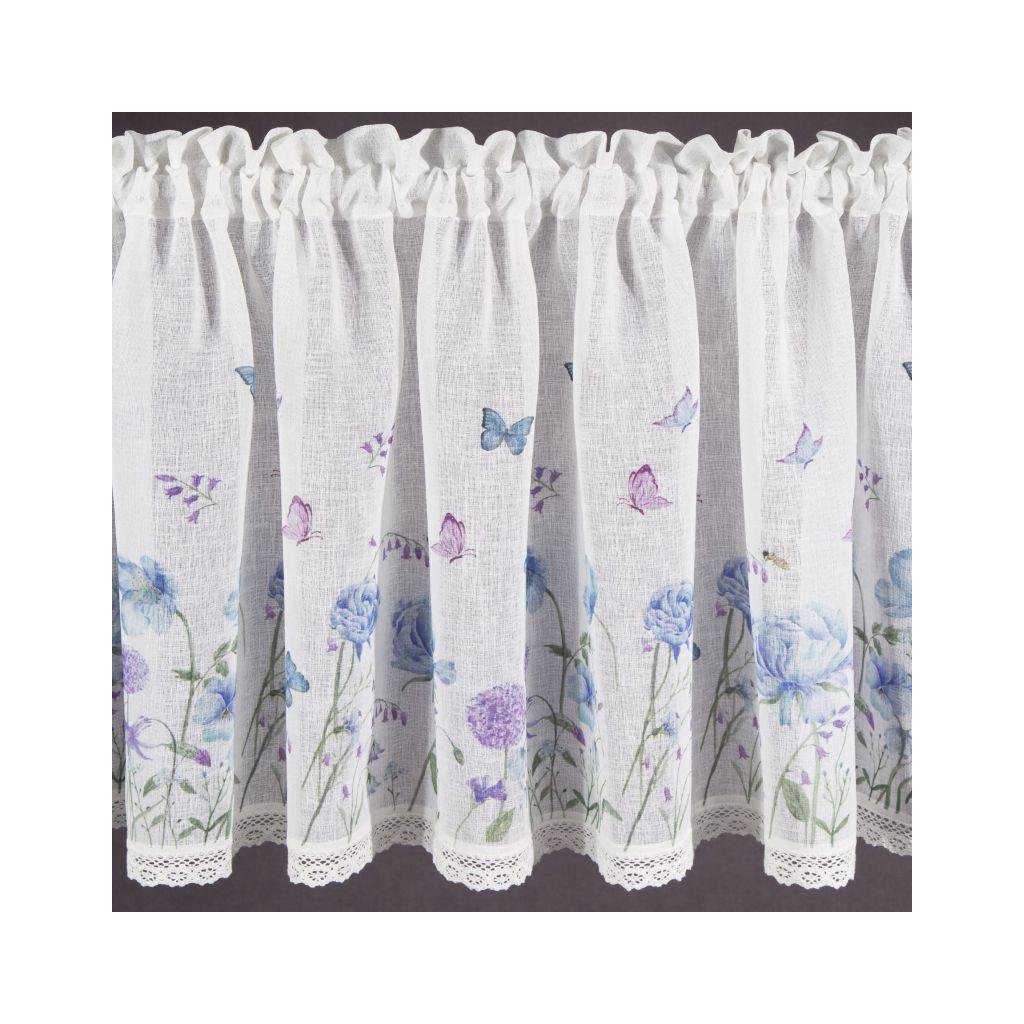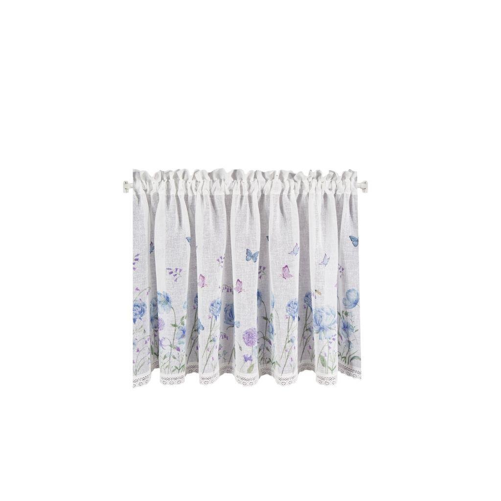 Biela záclona ZOJA so vzorom letných kvetov a motýľov a v spodnej časti zdobená pásom bavlnenej čipky. Šírka: 150 cm, dĺžka: 60 cm. Zloženie: 100% polyester. Ľahké žehlenie a pranie. Praktické zavesenie na tuneli.