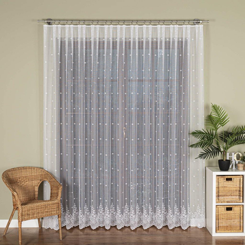 Žakarová záclona ARTURA vyniká jemným kvetinovým vzorom, ktorý je rozmiestnený po celej ploche vo forme drobných kvietkov. Tento detail pôsobí nežne a romanticky, pričom vnáša do interiéru ľahkosť a čistotu. Záclona zároveň prepúšťa denné svetlo a poskytuje príjemné súkromie.