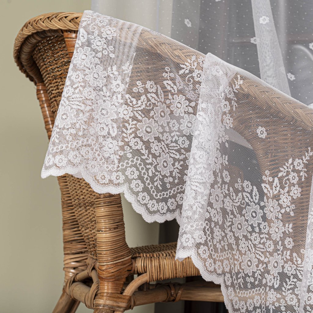 Prémiová žakarová väzba dodáva materiálu trvácnosť, odolnosť a elegantný pád. Spodný okraj je ozdobený bohatou čipkovanou bordúrou s jemným vlnitým ukončením, ktoré dodá každému oknu decentný luxusný nádych. Vďaka svojmu dizajnu sa hodí do klasických aj moderných priestorov.