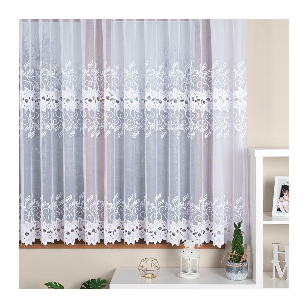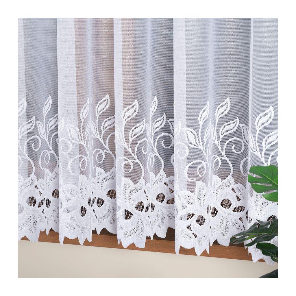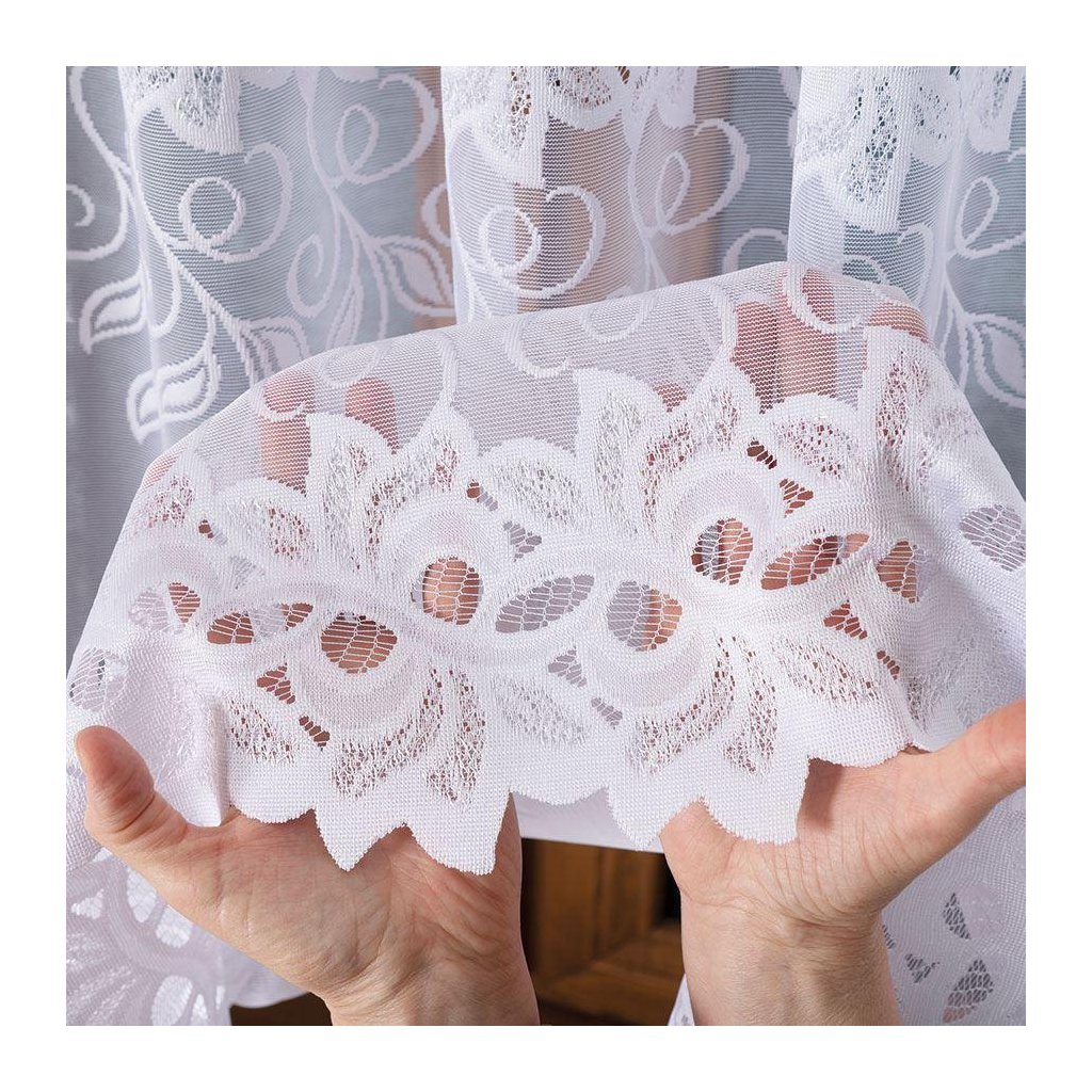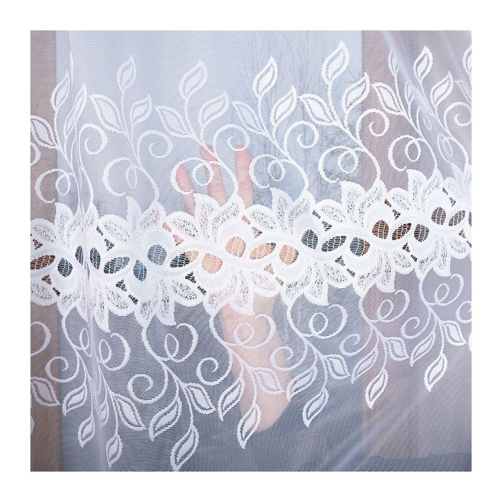 Záclona je ušitá z kvalitnej žakárovej tkaniny zo 100 % polyesteru – je ľahučká, priedušná a pekne drží tvar. Jemný reliéfny vzor s prepracovaným okrajom pôsobí ako čipková bordúra, ktorá dodá oknu štruktúru a ženskú mäkkosť. Dekór tvorí jemná sieťka s ornamentmi lístkov a špirál, uprostred okna sa stretáva širší dekoratívny pás s bohatším kreslením a smerom dole prechádza do vlnkovaného (scallop) lemu s drobnými „zúbkami“. Vďaka tomuto gradovaniu je pohľad k parapetu jemný a dekoratívny, no nikdy nie ťažký. Materiál je odolný voči vyťahaniu, po zavesení splýva do rovnomerných vĺn a aj po rokoch vyzerá sviežo.