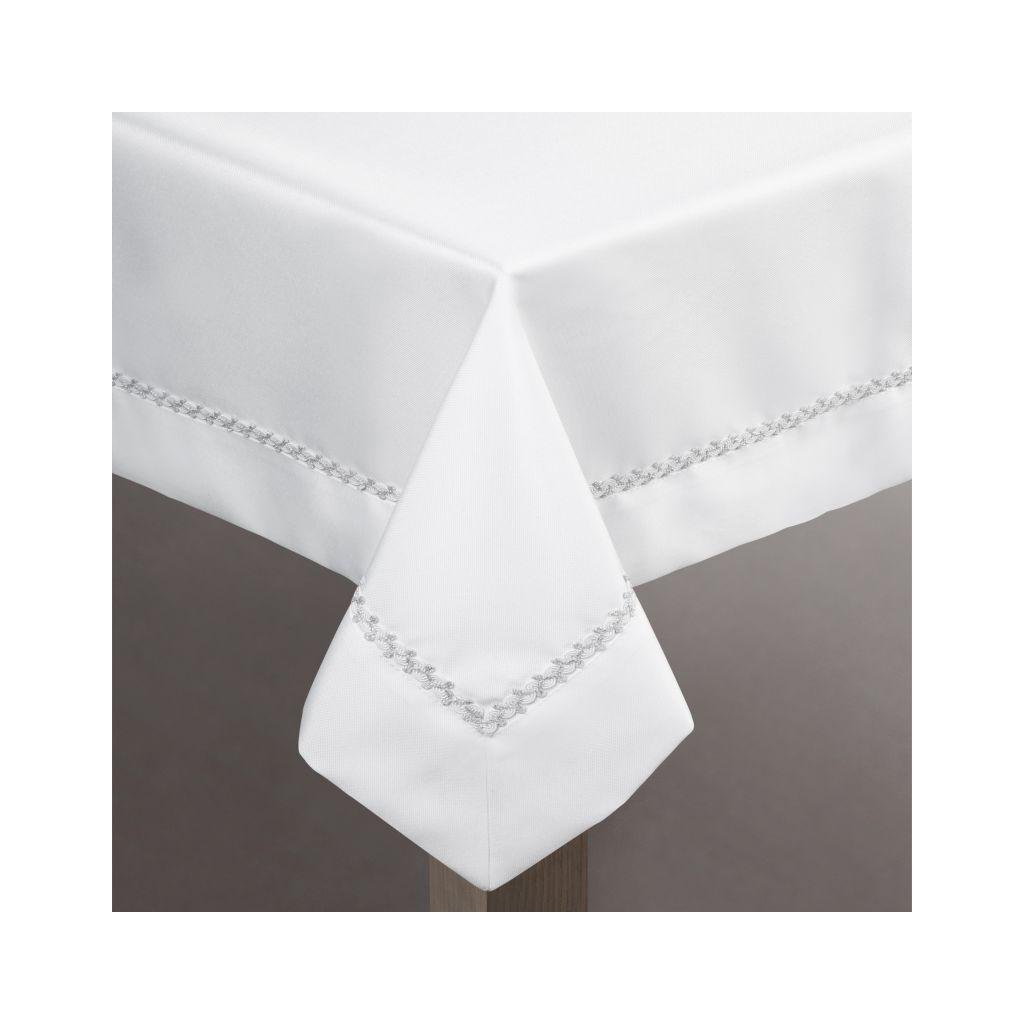 Biely obrus MELI zdobený elegantným pásikom a lemom so striebornými prvkami v nádhernom balení. Šírka: 145 cm, dĺžka: 260 cm. Zloženie: 100% polyester