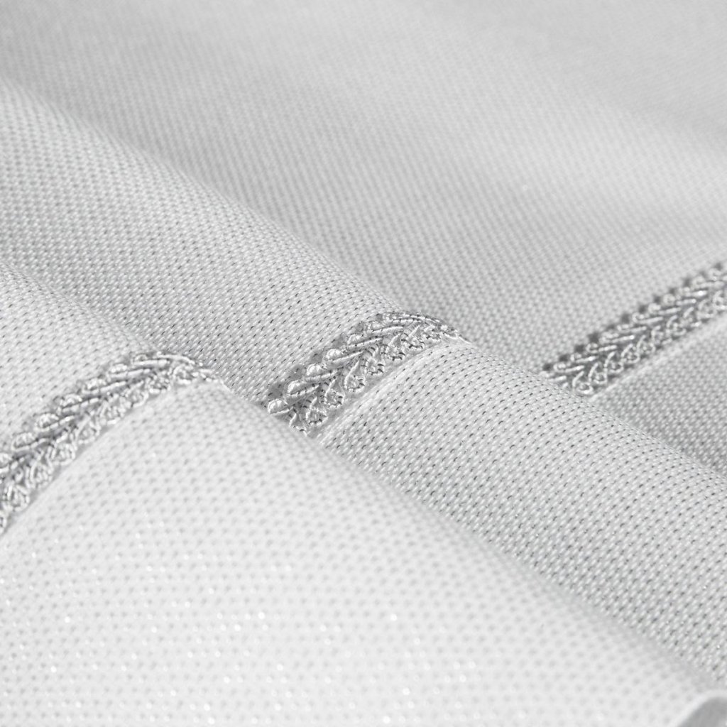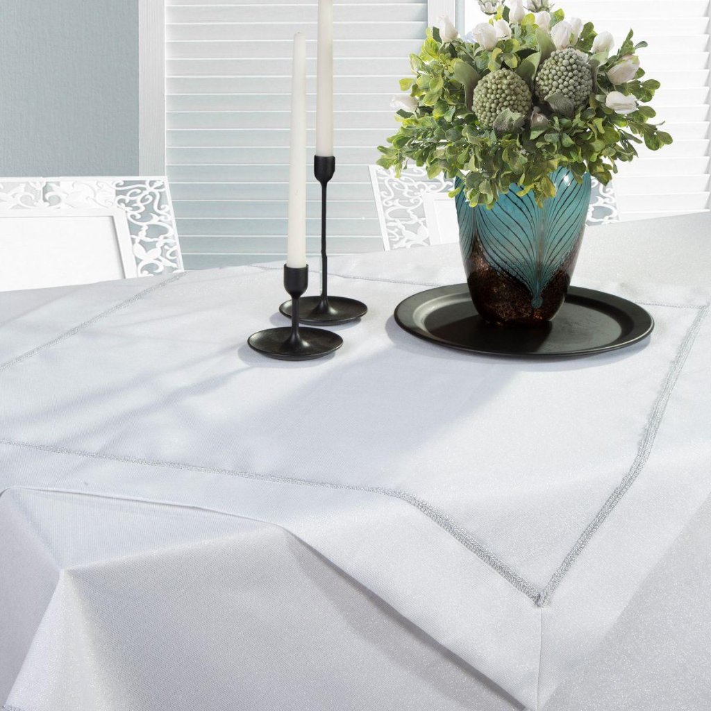 Lesklý látkový obrus bielej farby, zdobený strieborným lemom v elegantnom balení. Šírka: 145 cm, dĺžka: 350 cm. Zloženie: 100% polyester