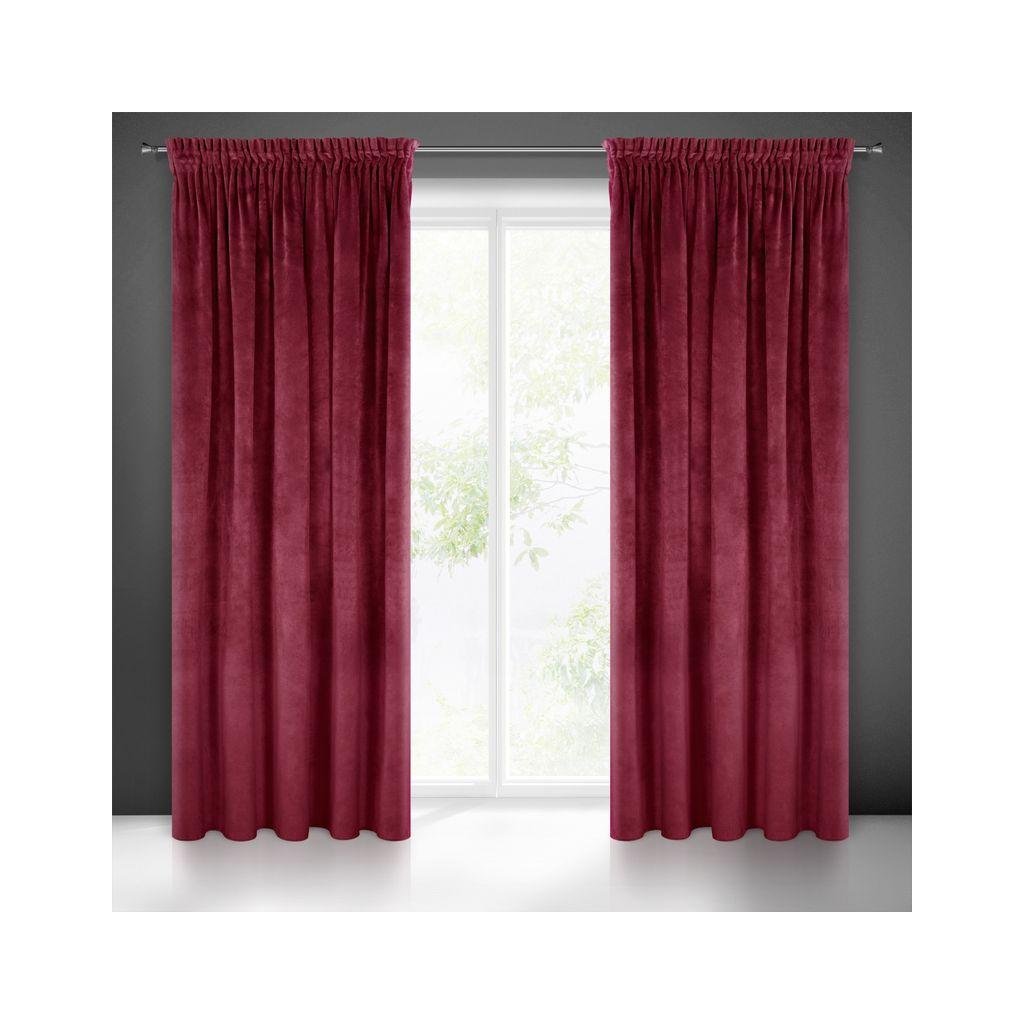Zamatový jednofarebný bordový záves RIA. Masívna látka poskytuje vysoký stupeň vnútorného zatemnenia. Šírka: 140 cm, dĺžka: 270 cm. Zloženie: 100% polyester. Gramáž 290 g/m2. Praktické zavesenie na riasiacej páske.