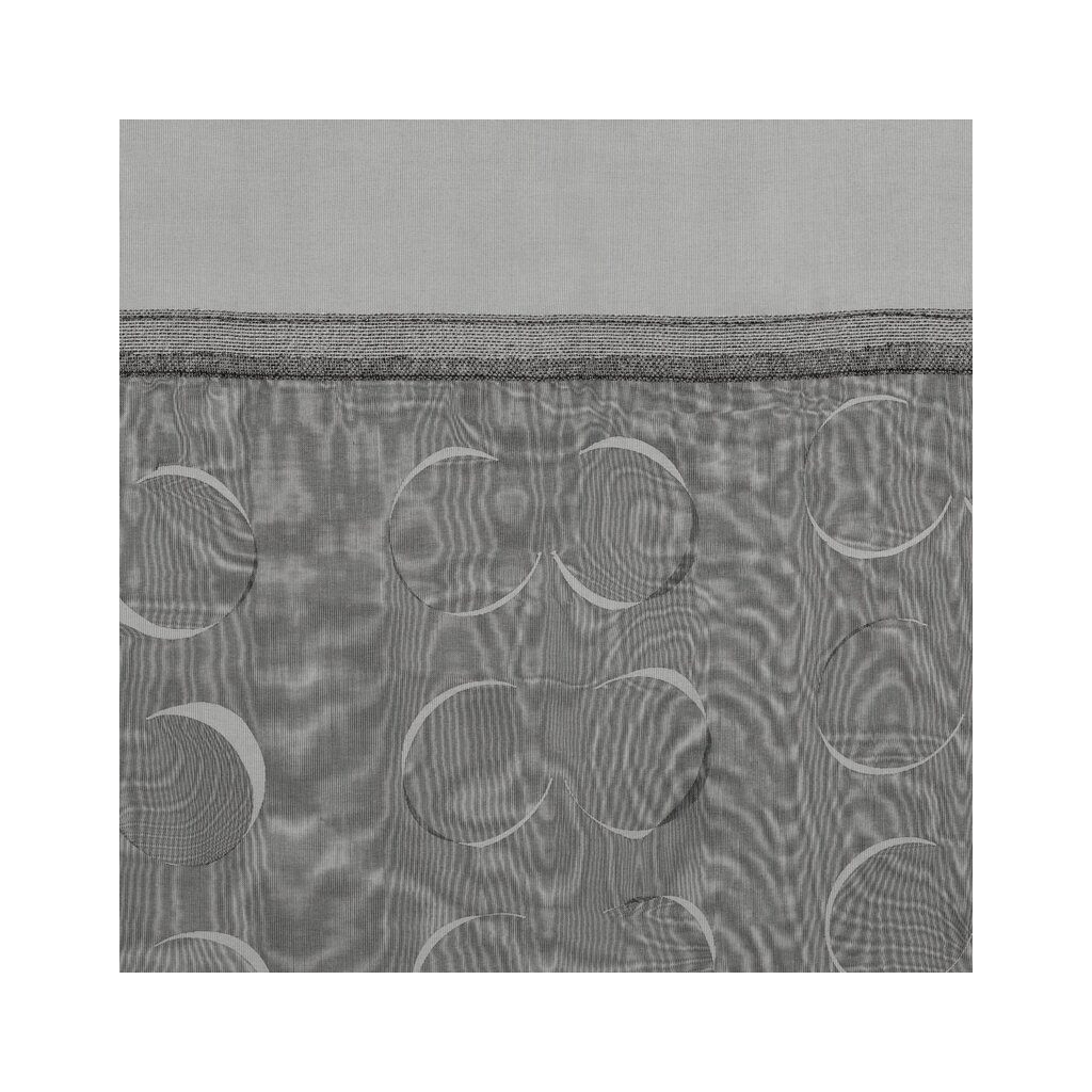 Spodná časť je ozdobená laserovo vyrezávanými kruhmi, ktoré dodávajú záclone originálny charakter a robia z nej výrazný prvok okna. Dekor dopĺňa strieborná stuha, ktorá opticky oddeľuje vzor od hladkej časti tkaniny a pridáva jej elegantný lesk a štýlový detail.