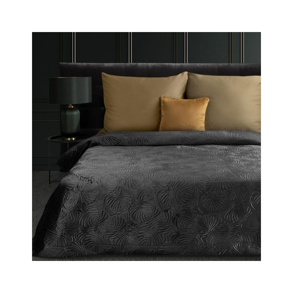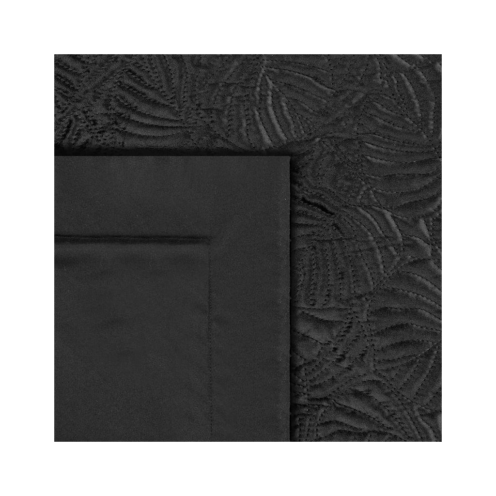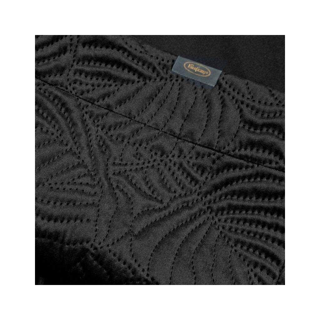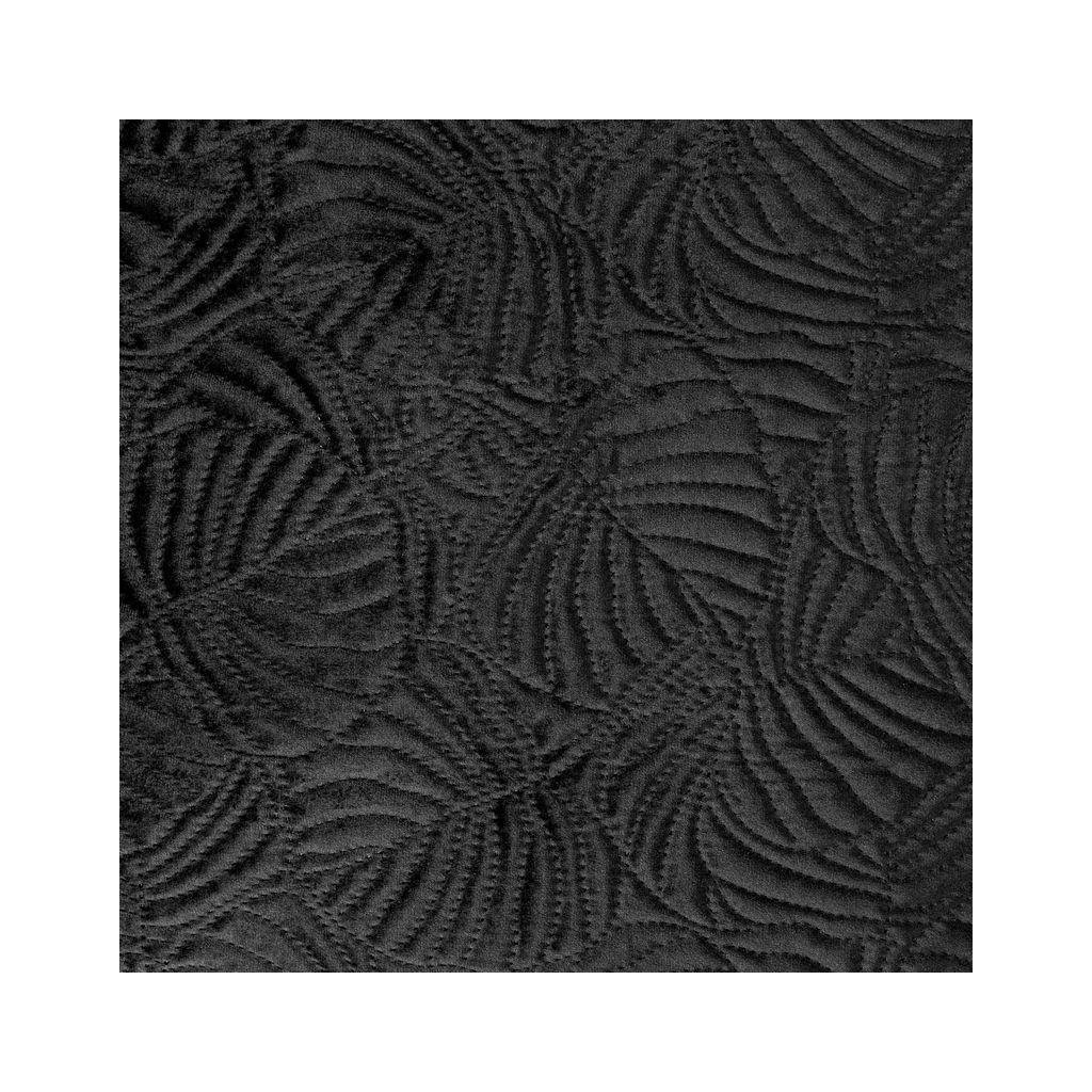 Majestátny čierny zamatový prehoz na posteľ z kolekcie LILI4 vyrobený metódou hot press, lisovaním za tepla. Reliéfna potlač listov lekna dodáva interiéru spálne magické čaro, eleganciu a moderný vzhľad. Šírka: 220 cm, dĺžka: 240 cm. Gramáž: 200 (hore) +120 (výplň) +70 (dole) g/m2. Zloženie: 100% polyester.