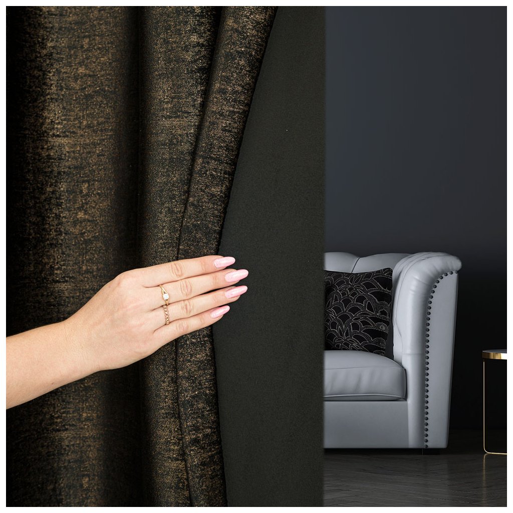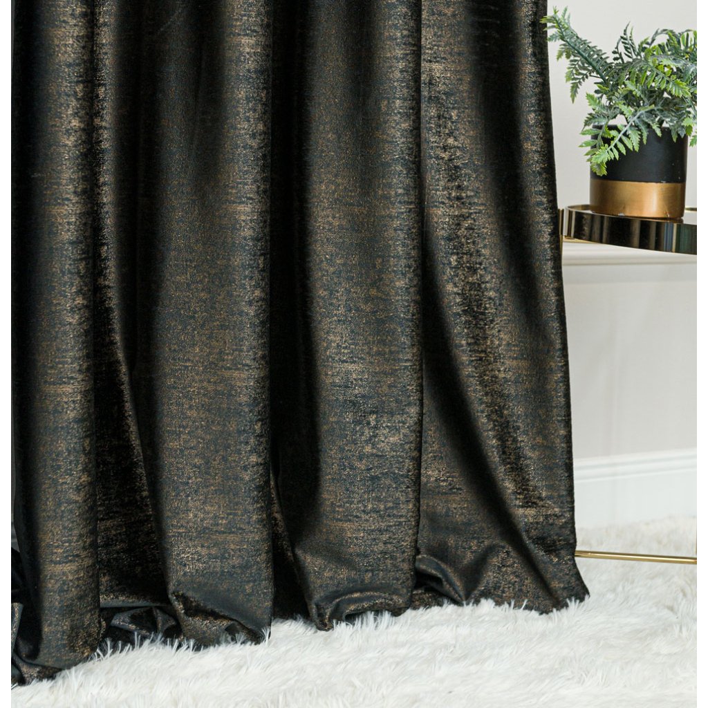 Elegantný zamatový záves s jemnou zlatou potlačou dodá interiéru luxusný, teplý charakter. Husto tkaný zamat krásne splýva a pri dopade svetla vytvára noblesný, jemne sa meniací lesk – dokonale zvýrazní okno v modernom aj klasickom štýle.