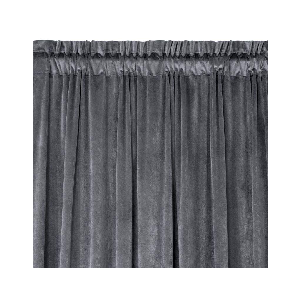 Zamatový jednofarebný grafitový záves. Zamatová látka s hustotou 200g/m2 poskytuje stredný stupeň vnútorného zatemnenia. Šírka: 140 cm, dĺžka: 270 cm. Zloženie: 100% polyester. Praktické zavesenie na riasiacej páske.