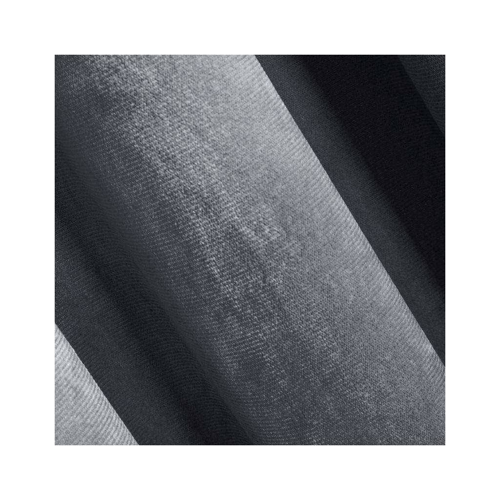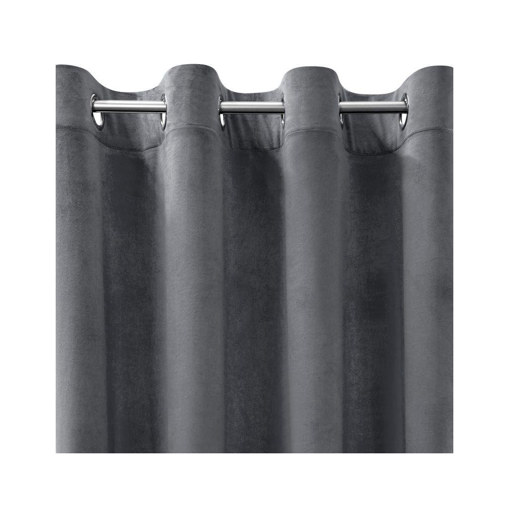 Zamatový jednofarebný grafitový záves. Zamatová látka s hustotou 200g/m2 poskytuje stredný stupeň vnútorného zatemnenia. Šírka: 140 cm, dĺžka: 250 cm. Zloženie: 100% polyester. Praktické zavesenie na kovových krúžkoch.