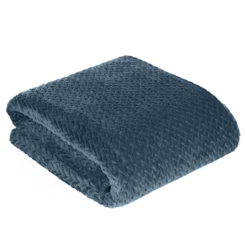 Krásna deka vyrobená z látky príjemnej na dotyk. Jednofarebná modrá nadýchaná textúra je zdobená minimalistickým vzorom rybích kostí.