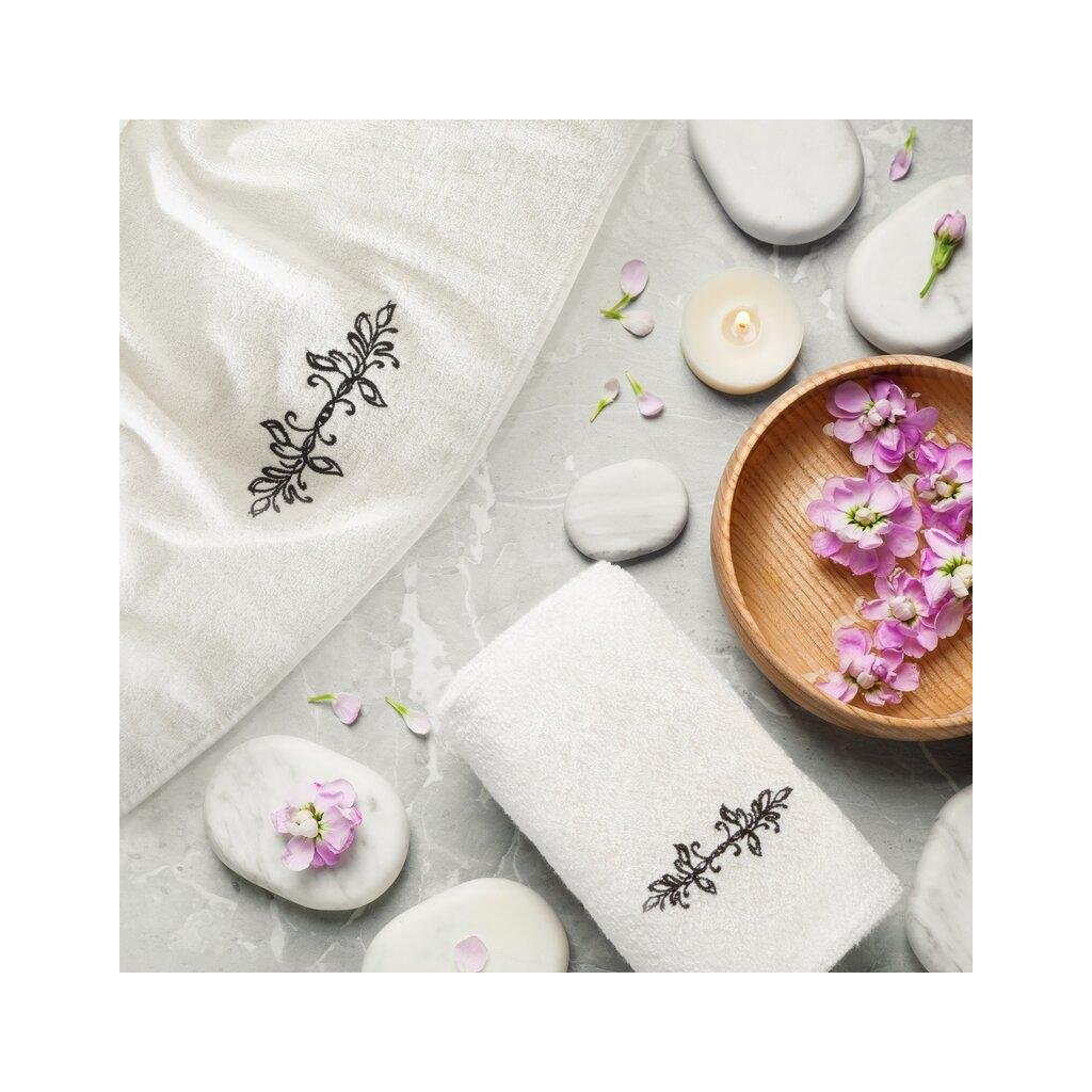 Sada uterákov KAMELIA je vyrobená zo 100% mäkkej a savej bavlny. Uteráky sú príjemné na dotyk a odolné voči opotrebeniu. Sú zdobené elegantnou výšivkou s motívom rastlinných ornamentov, čo dodáva celkovej estetike jedinečný šarm. Každý uterák má gramáž 380 g/m2, čo zaručuje jeho dlhodobú životnosť.