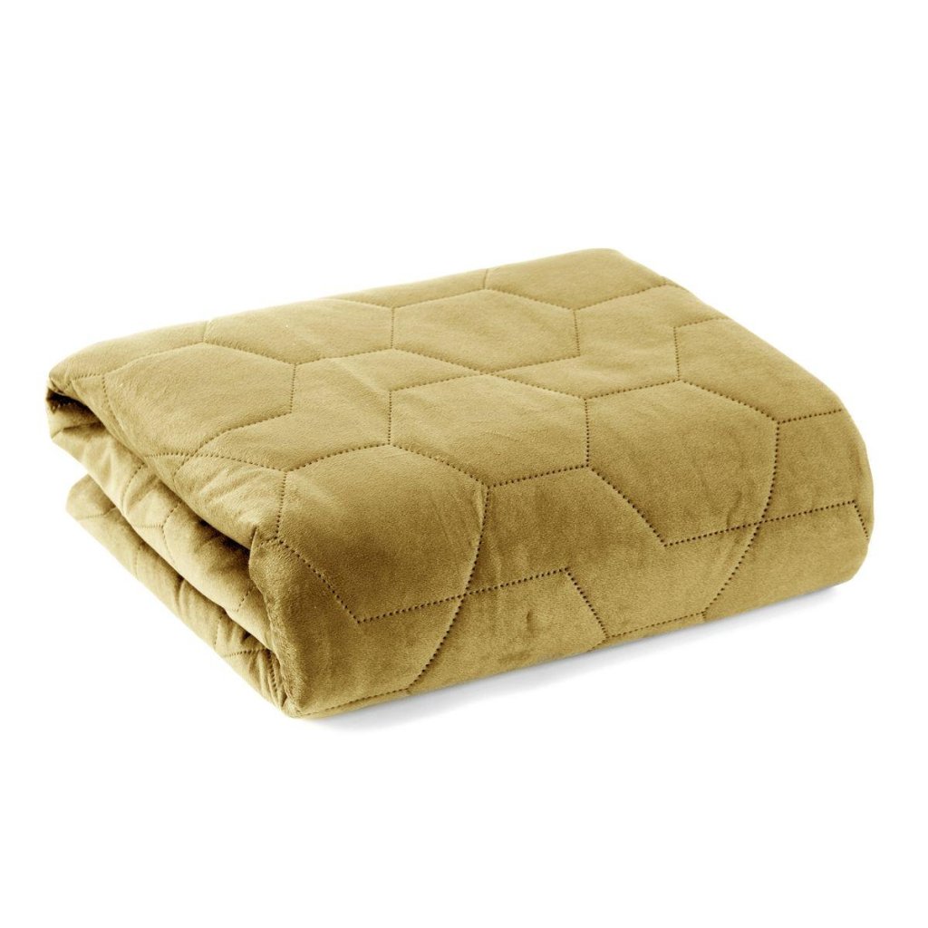 Obojstranný prehoz na posteľ horčicovej farby, vyrobený metódou hot press s velúrovou vrchnou stranou. Možno prať v práčke. 220x240 cm.