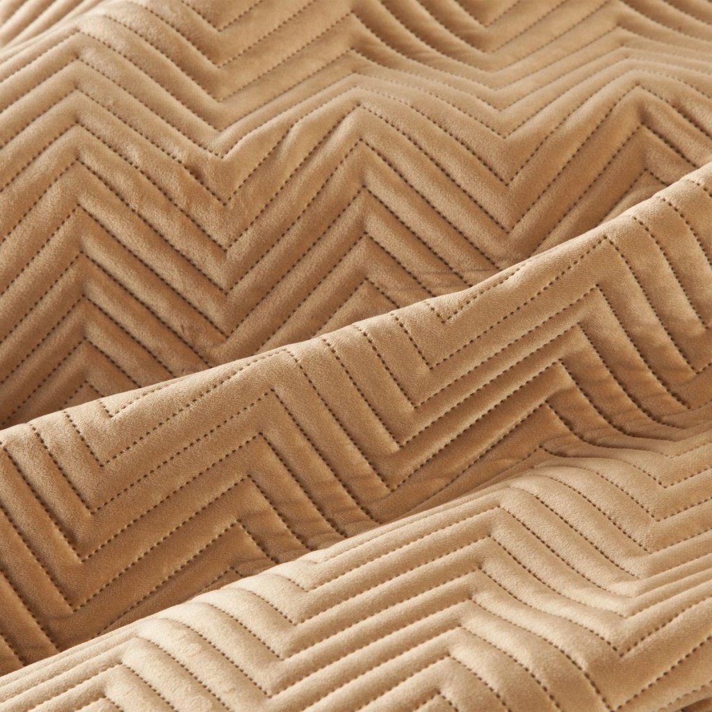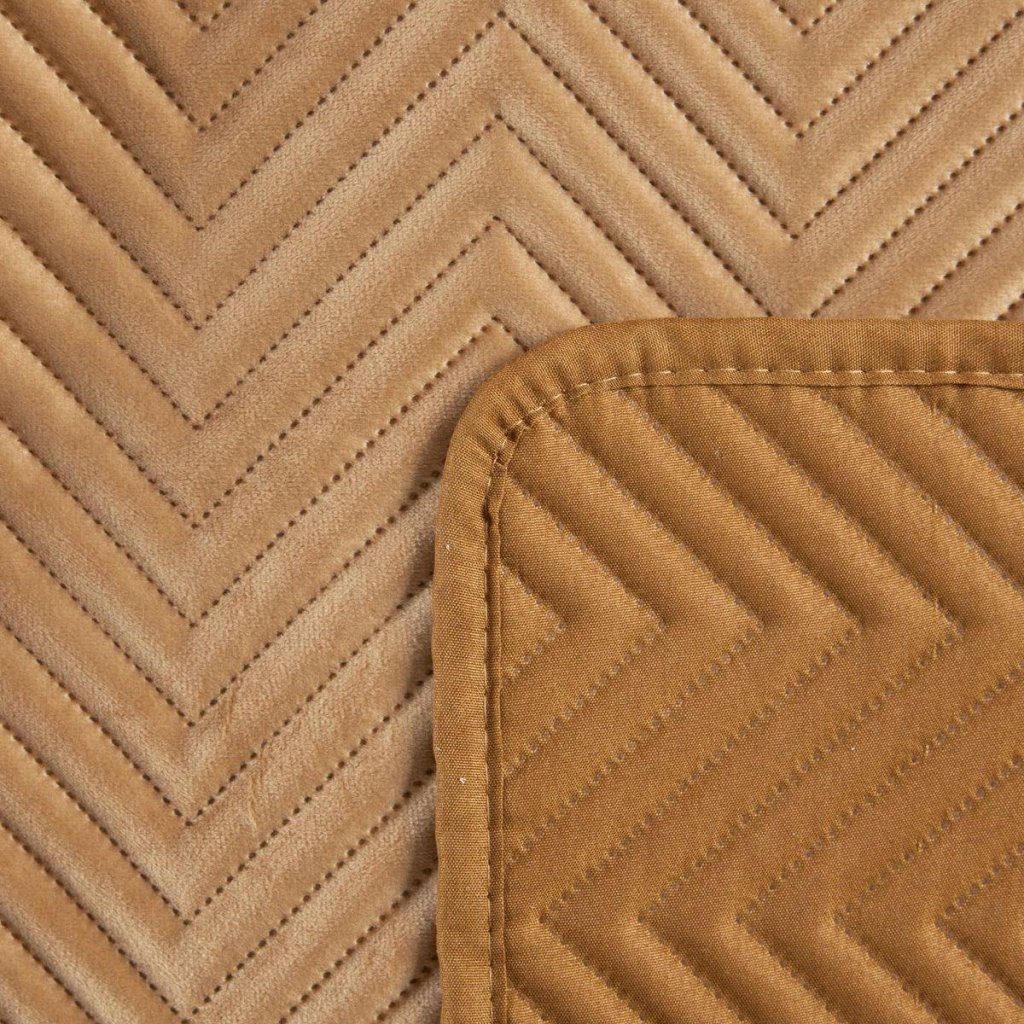 Exkluzívny prehoz horčicovej farby z mäkkej a na dotyk príjemnej zamatovej látky, zdobený vzorom rybej kosti. Na prešívanie bola použitá bezšvová metóda hotpress. Možno prať v práčke. 220x240 cm