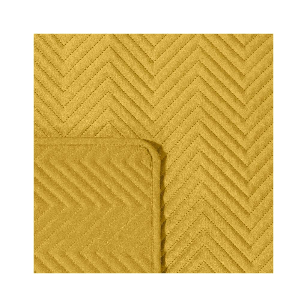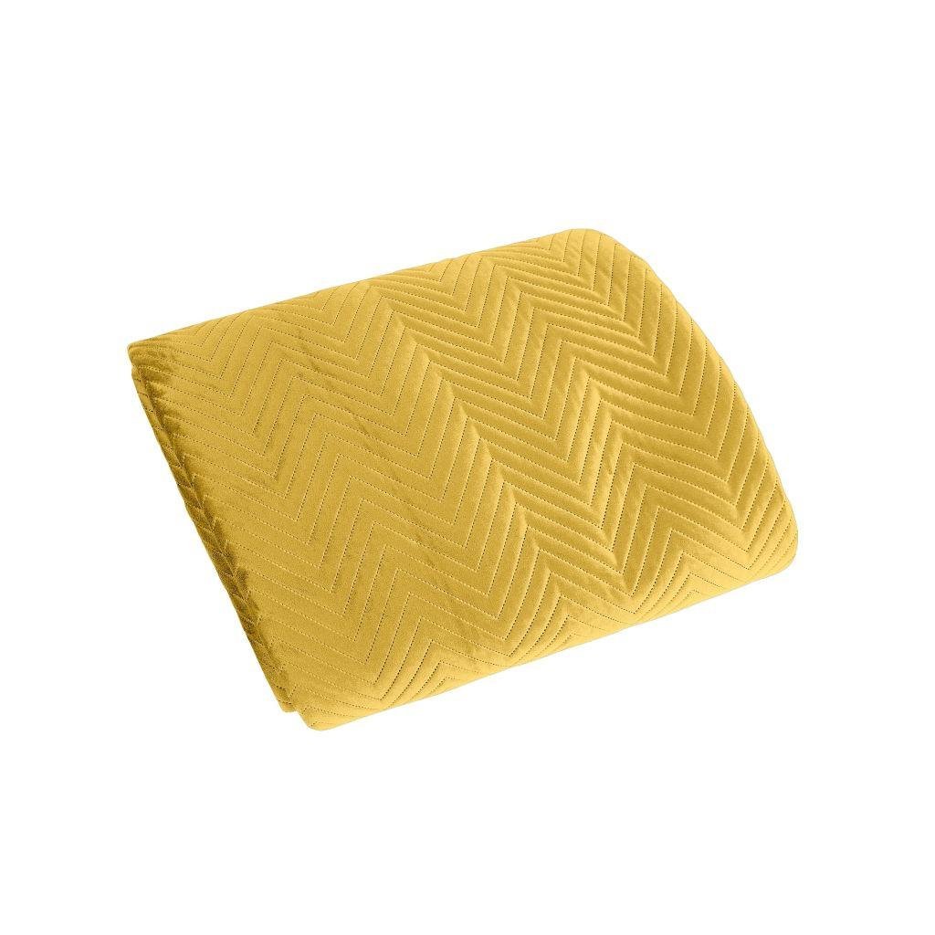 Exkluzívny prehoz horčicovej farby z mäkkej a na dotyk príjemnej zamatovej látky, zdobený vzorom rybej kosti. Na prešívanie bola použitá bezšvová metóda hotpress. Možno prať v práčke. 220x240 cm