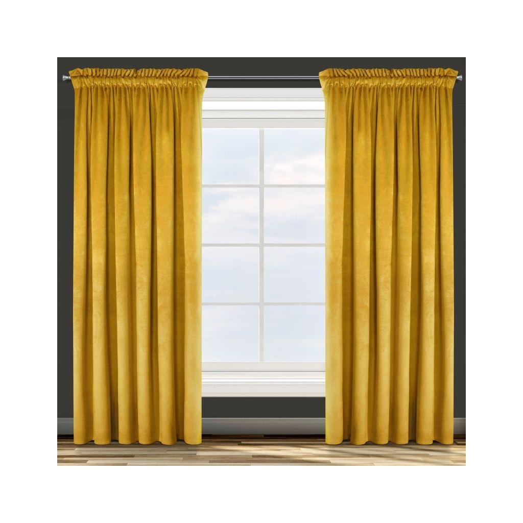 Zamatový jednofarebný horčicový záves. Zamatová látka s hustotou 200g/m2 poskytuje stredný stupeň vnútorného zatemnenia. Šírka: 135 cm, dĺžka: 300 cm. Zloženie: 100% polyester. Praktické zavesenie na riasiacej páske.