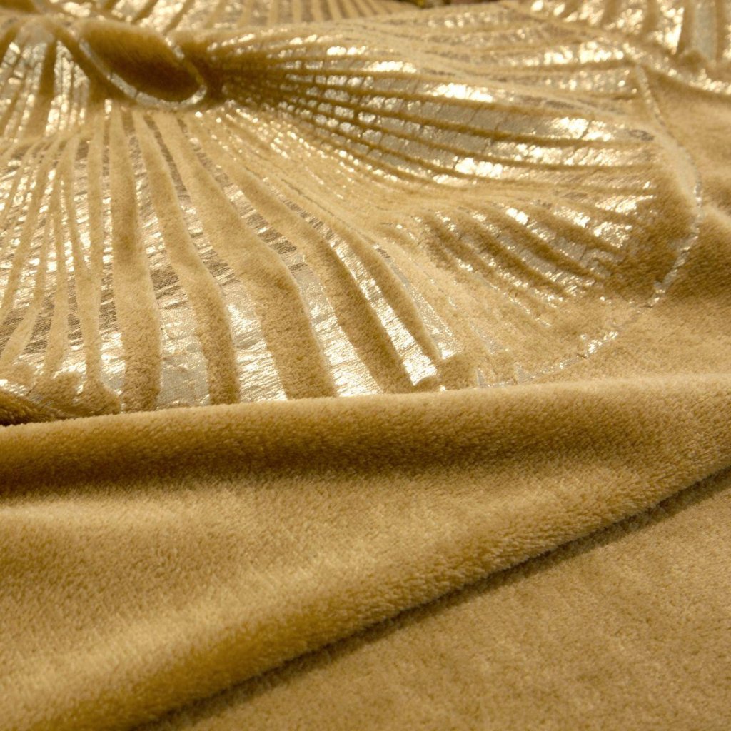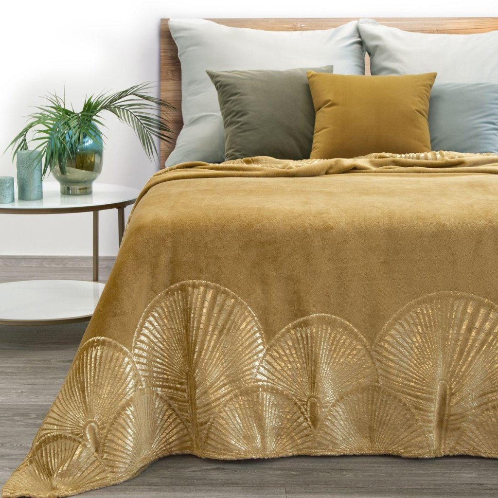 Mäkká a jemná flano deka horčicovej farby s lesklou zlatou potlačou.