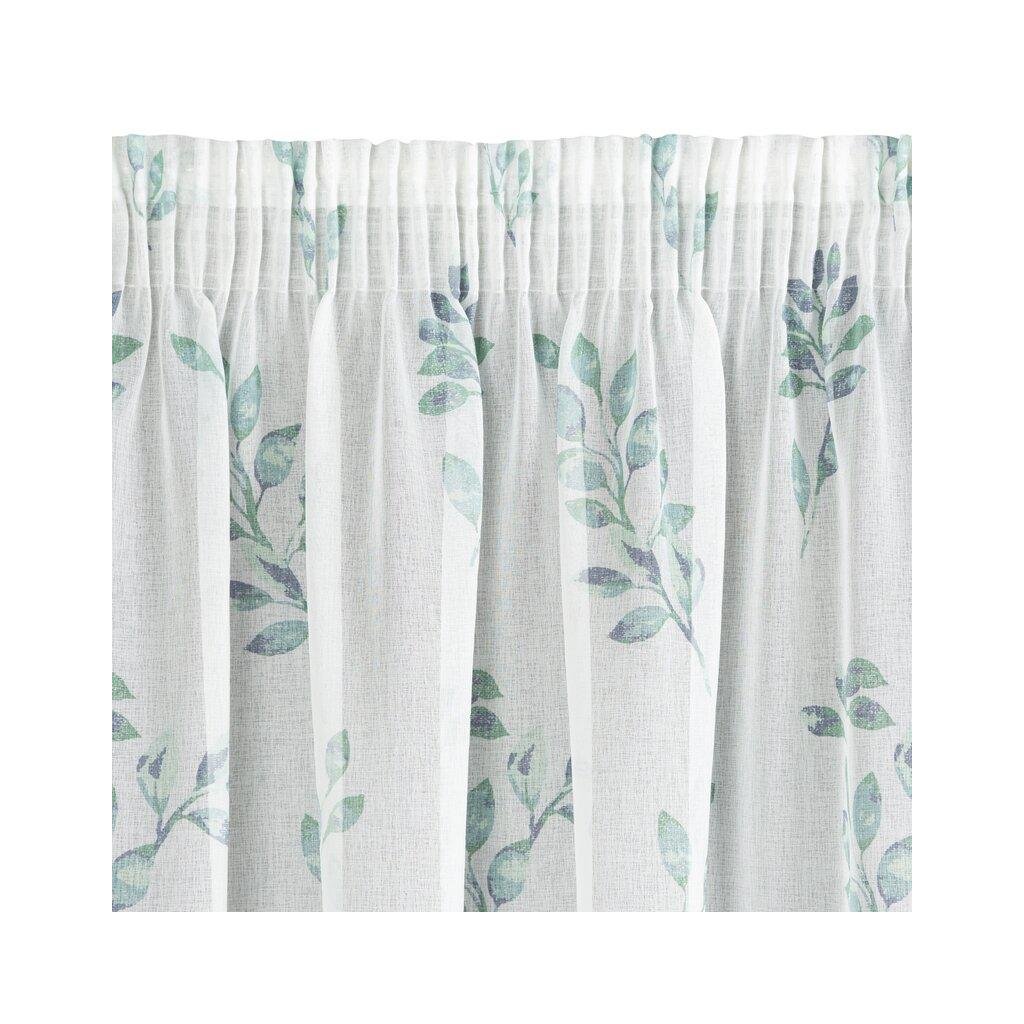 Záves CLARISSA, nádherná okenná dekorácia, vyrobená zo svetlej látky podobnej gáze v spodnej časti závesu s motívom lístkov. Šírka: 140 cm, dĺžka: 270 cm, farba: biele pozadie s modrými a tyrkysovými lístkami, Hmotnosť: 75 g/m2, Zloženie: 100% polyester. Ľahké žehlenie a pranie. Praktické zavesenie na riasiacej páske.