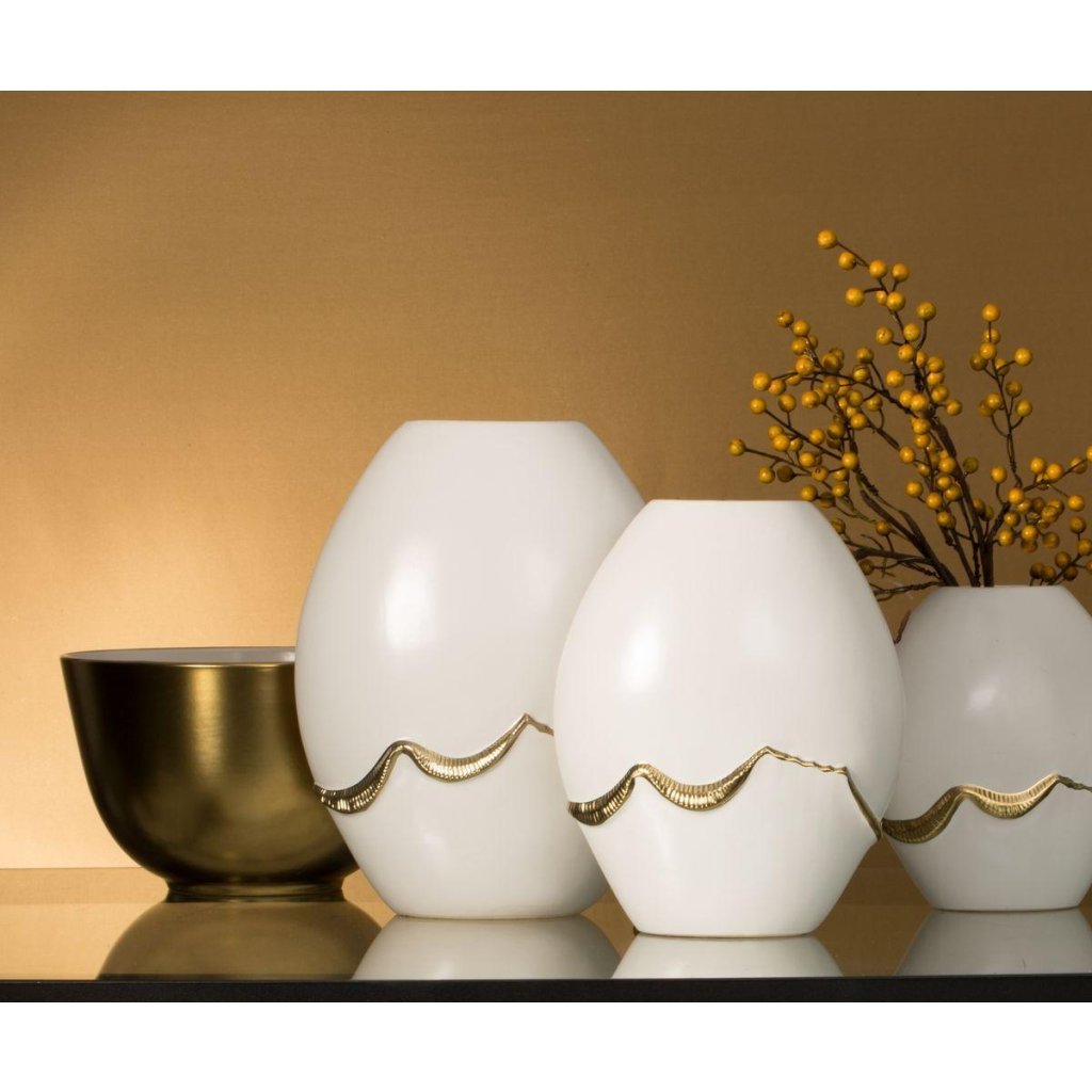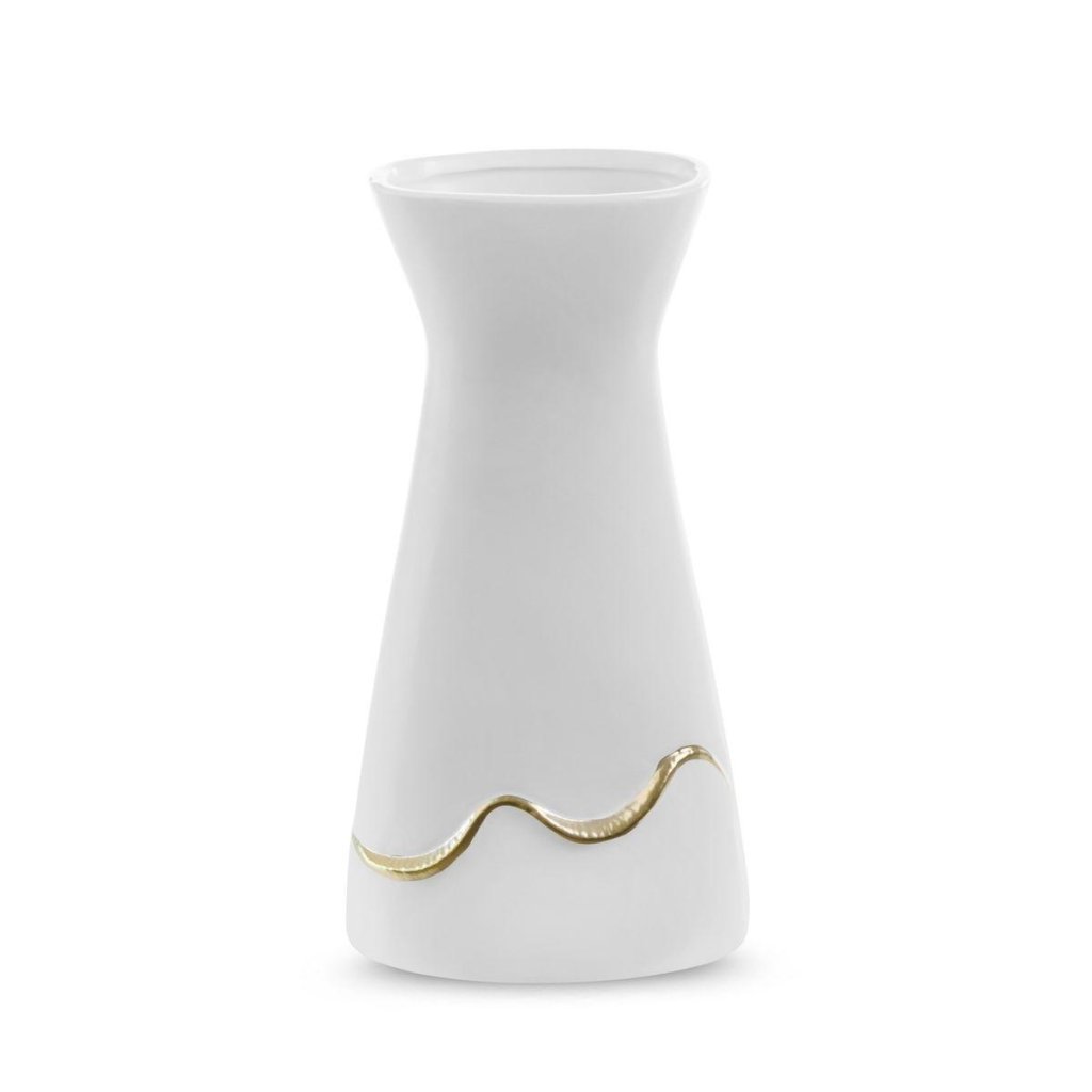 Keramická dekoračná váza z kolekcie EBRU s jednoduchým tvarom je elegantným doplnkom, z ktorého je ťažké odtrhnúť zrak. Originálna keramická váza - biela, s jemným zlatým ornamentom, je elegantným a nadčasovým detailom, ktorý sa skvele hodí do moderného interiéru. Keramická váza EBRU je dekoratívny prvok, do ktorého môžete uložiť umelé alebo sušené kvety. Nezabudnite sa zoznámiť s ostatnými prvkami tejto úžasnej kolekcie a vytvorte si súpravu šitú na mieru vašim potrebám. Dodajte interiéru štýl – garantujeme, že okolo takýchto doplnkov nikto ľahostajne neprejde.