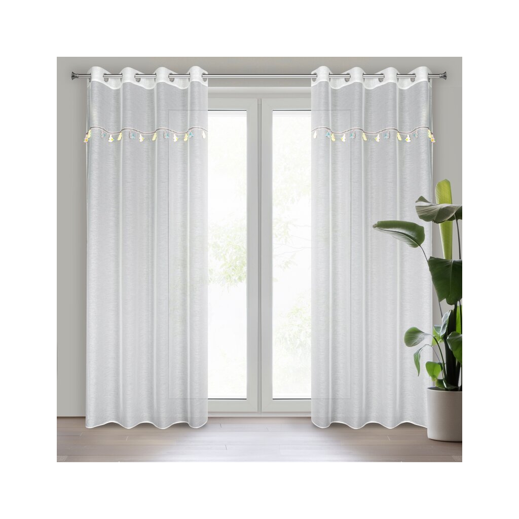 Záclona je vyrobená z ľahkého a vzdušného etamínu, ktorý krásne ozdobí okno bez toho, aby zatemnil interiér. Vďaka svojej transparentnosti prepúšťa prirodzené denné svetlo, čím vytvára príjemnú atmosféru a zároveň zachováva pocit priestoru a vzdušnosti.