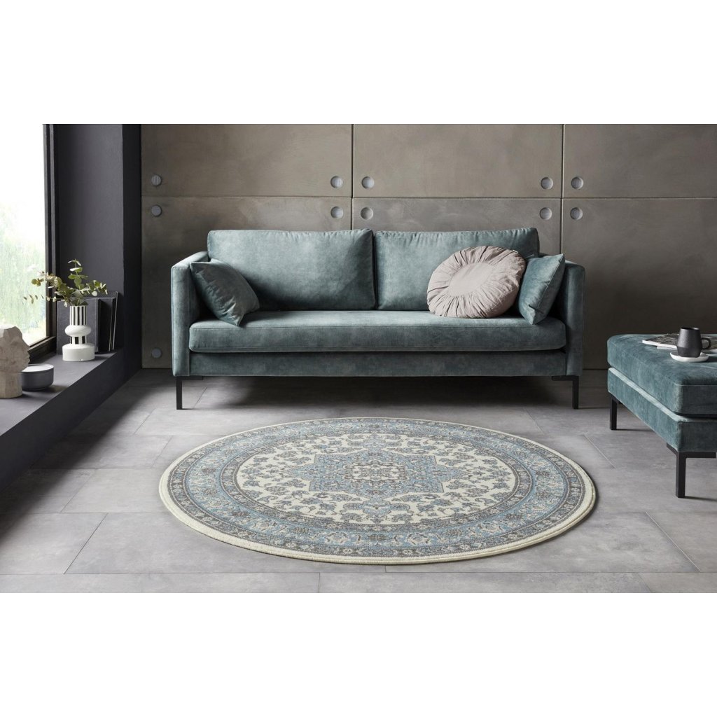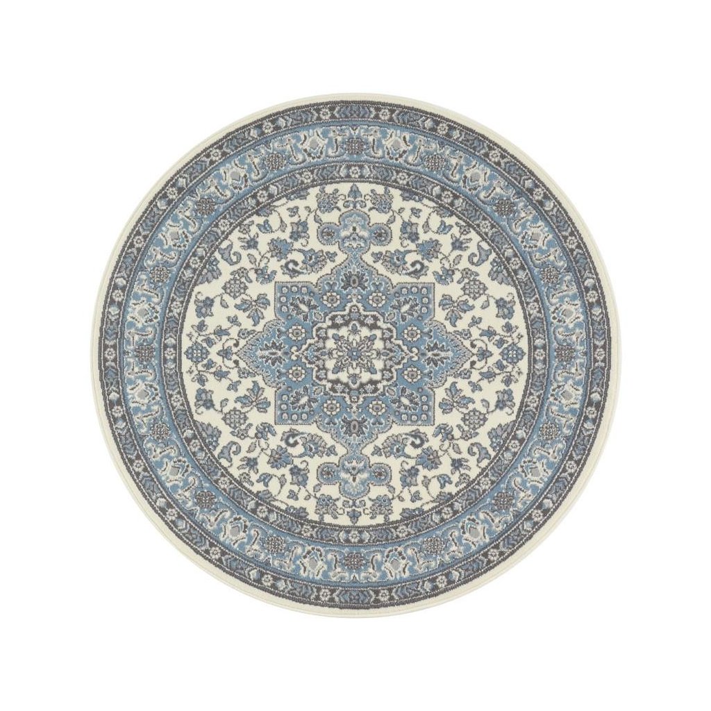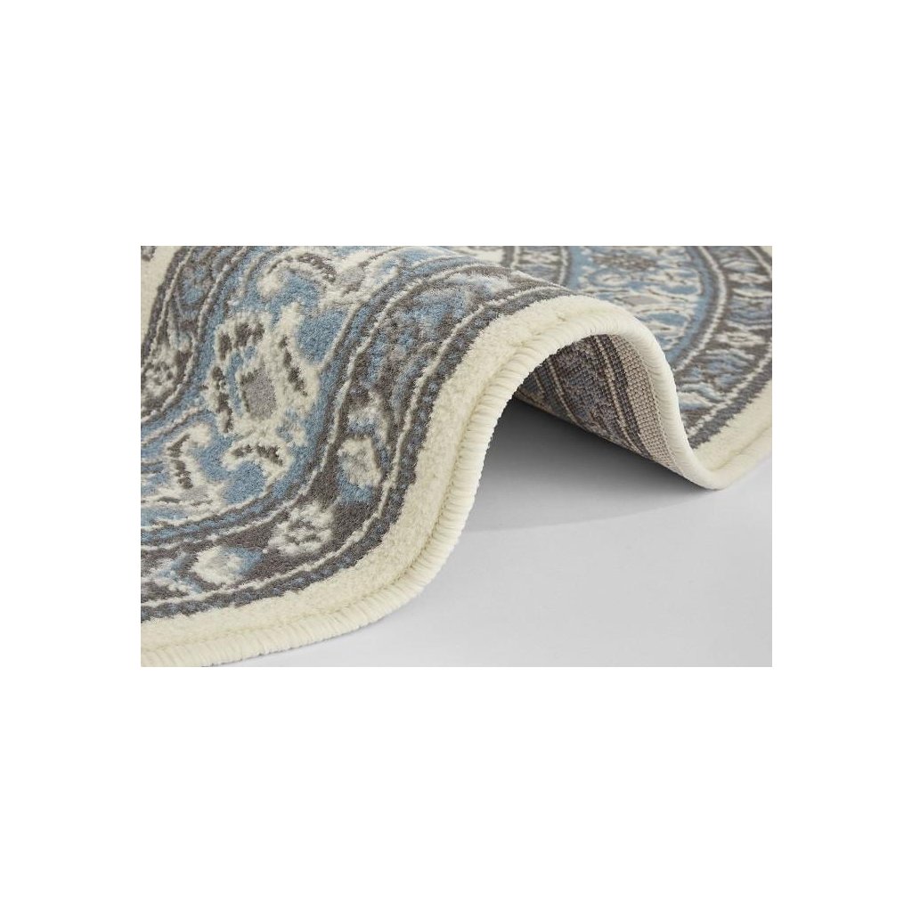 Pekný kruhový koberec s prepracovaným orientálnym vzorom, ktorý skutočne zaujme. To je koberec 104442 Cream / Skyblue zo 100% polypropylénového vlákna. Ak potrebujete štýlový koberec, ktorý vyniká nielen svojím motívom, ale aj dobrou kvalitou a pritom priaznivou cenou, potom je Mirkan pre Vás skvelou voľbou. Poteší tiež kratšom vlasom pre ľahšiu údržbu či obšitím na všetkých stranách a dá sa dobre čistiť šampónom, alebo penou na koberce.