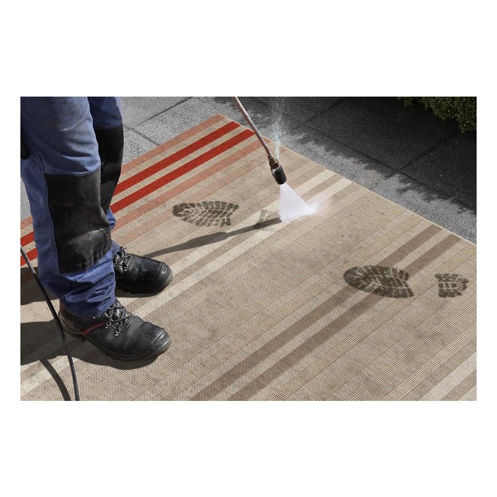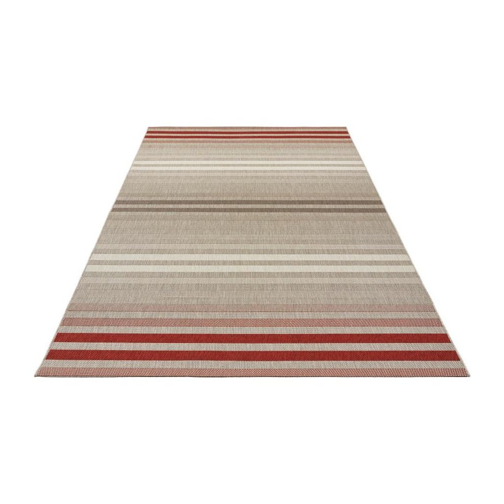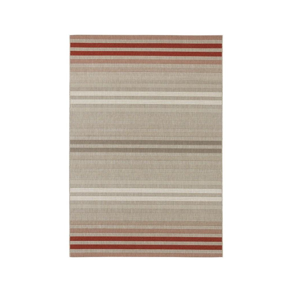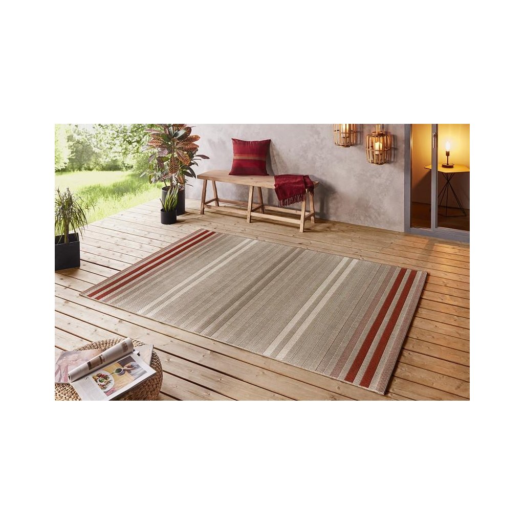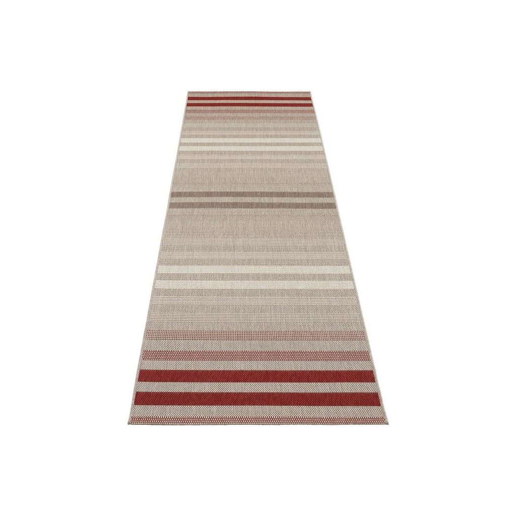Do červena sfarbený slučkový koberec s jednoduchým, ale atraktívnym pruhovaným vzorom, ktorý je jasnou voľbou nielen do moderného obývacej izby, ale tiež napr. Na terasu. Tento outdoorový a indoorový koberec zo 100% polypropylénu disponuje nízkym slučkovým vlasom, ktorý mu dodáva na pevnosti a odolnosťou. Ďalšou výhodou je tiež ľahká a bezproblémová údržba. Koberec je k dostaniu aj v behúňovom prevedení.