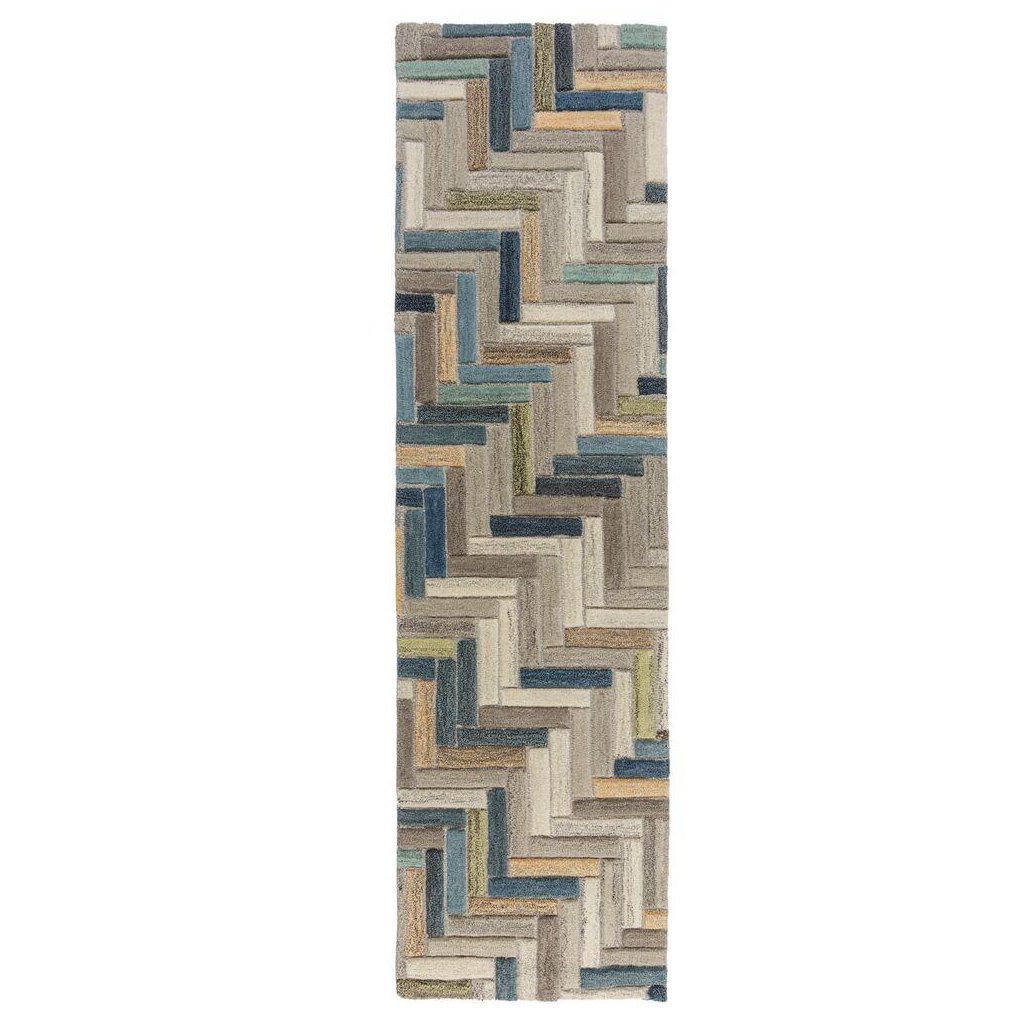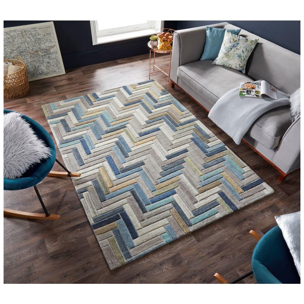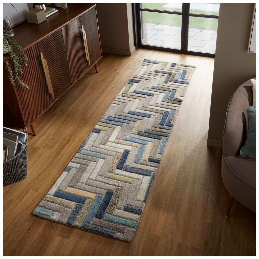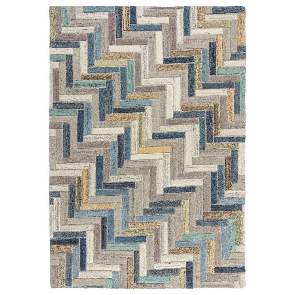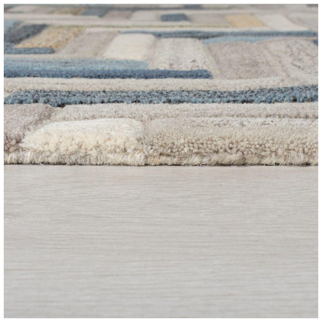 Vlnený koberec v prevažne modrých a béžových odtieňoch. Vďaka prestrihnutým obrysom sa môže pýšiť pútavým 3D efektom. Vlna je veľmi praktický prírodný materiál, ktorý izoluje chlad a tlmí hluk. Koberec sa preto najlepšie hodí do obývacej izby, spálne alebo chodby.