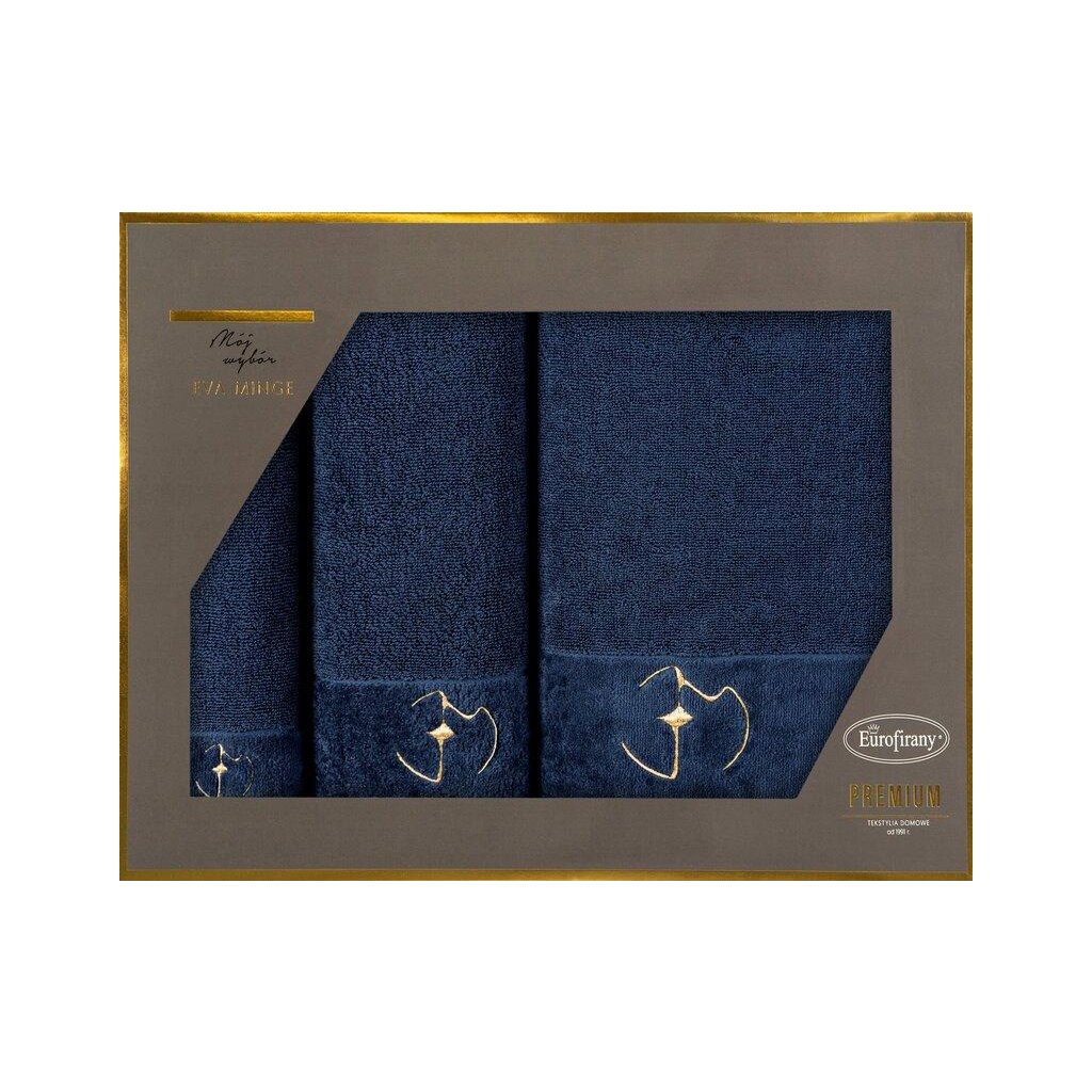 Modrá darčeková sada uterákov GAJA je skvelým nápadom na originálny a praktický darček. Táto sada troch farebne zladených uterákov je zabalená v elegantnej kartónovej krabici, ktorá podčiarkuje jej jedinečnosť a štýl. Uteráky a osušky z tejto kolekcie sú zdobené zamatovým okrajom a vyšívaným logom Ewa Minge, čo dodáva vašej kúpeľni osobitný charakter.