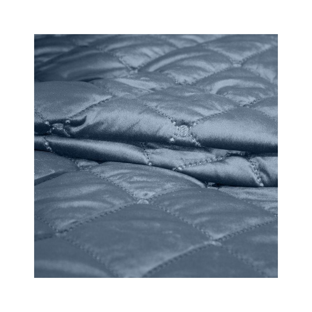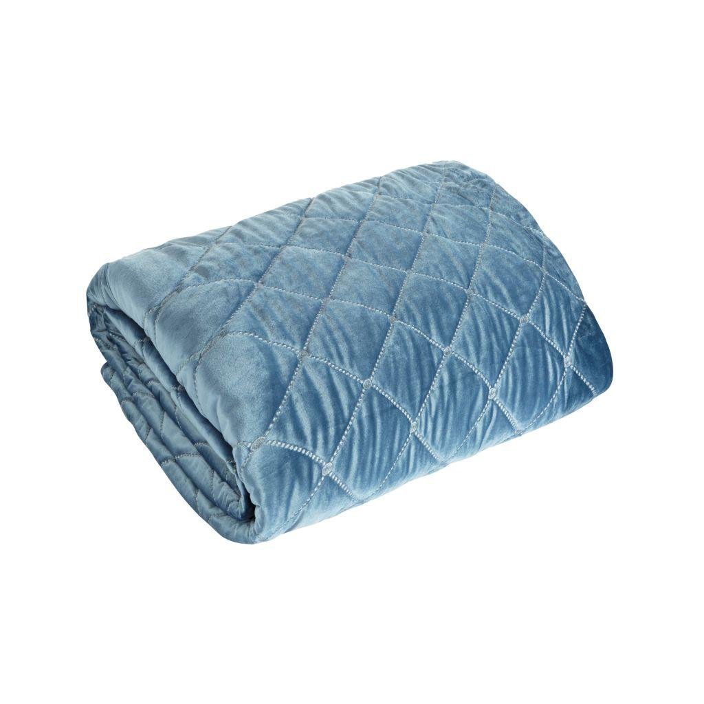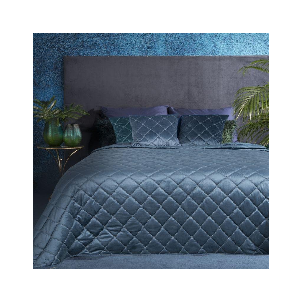 Zamatový modrý prehoz na posteľ so vzorom vyšívaných diamantov ktoré vytvárajú 3D efekt. 170x210 cm.