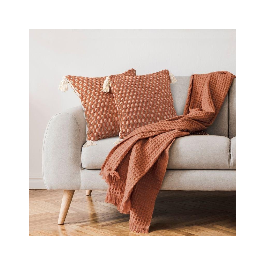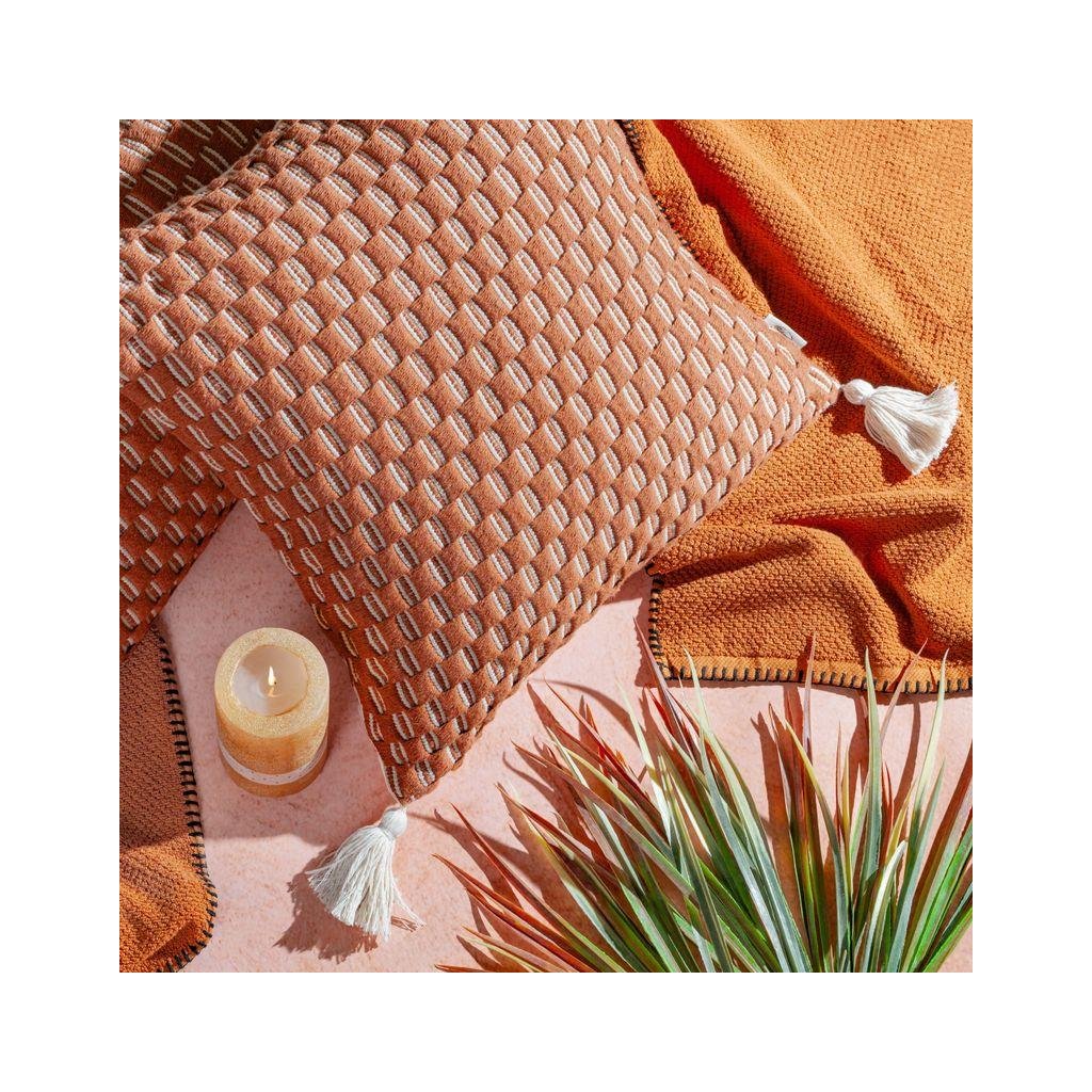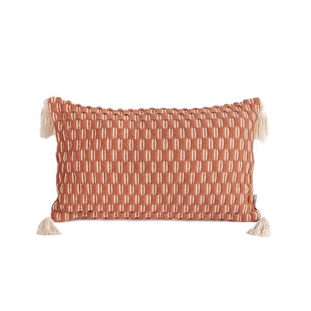 Dekoračná tehlovo-krémová obliečka na vankúš z kolekcie MOROCCO5B je vyrobená v eko štýle z hrubej bavlny. Žakárový vzor a ozdobné strapce na rohoch dodávajú obliečke veľmi módny a elegantný štýl. Je pevná a je odolná voči častému praniu. Šírka: 30 cm, dĺžka: 50 cm. Gramáž: 430 g/m2. Zloženie: 100% bavlna. Zapínanie na zips.