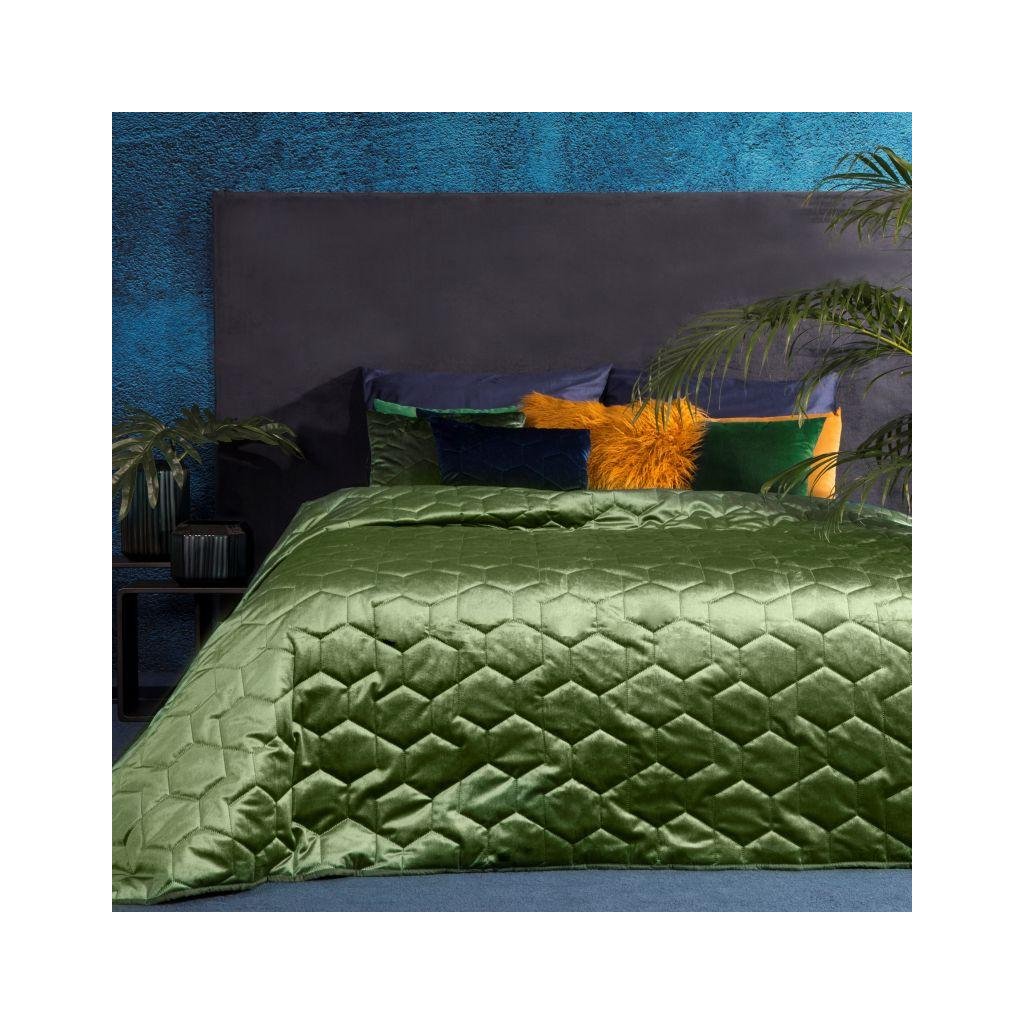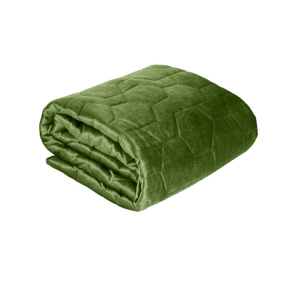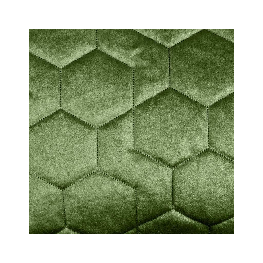 Zamatový prehoz olivovej farby s charakteristickým leskom, veľmi príjemný na dotyk. Minimalistické geometrické prešívanie je vyrobené odolnou bezšvovou metódou hotpress. Možno prať v práčke. 220x240 cm