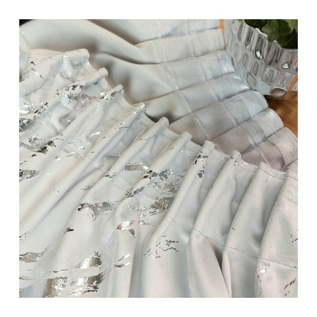 Luxusný zamatový záves MARMA s metalickou mramorovou potlačou prepojí eleganciu a moderný štýl. Husto tkaný zamat krásne splýva, má jemný noblesný lesk a na okne vytvára galerijný efekt – výrazný, no stále vkusný akcent.