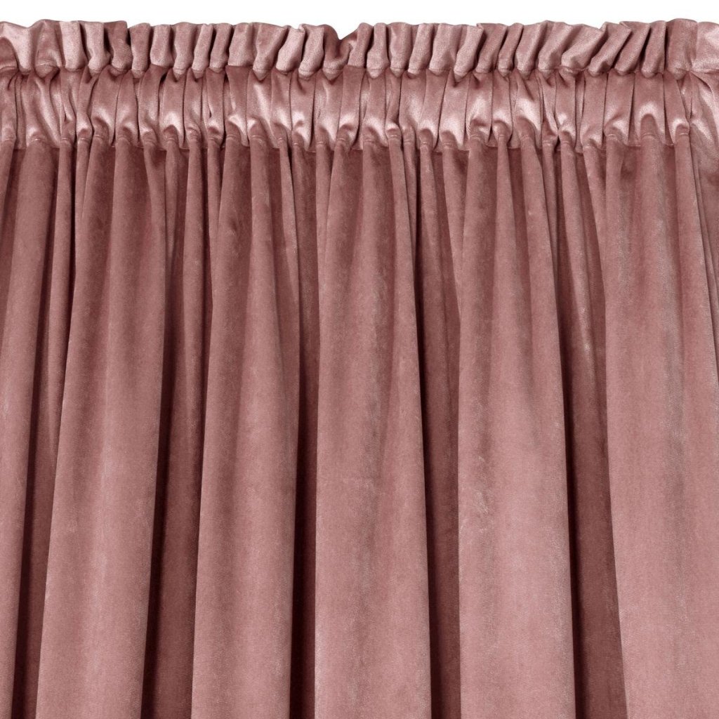 Zamatový jednofarebný ružový záves. Zamatová látka s hustotou 200g/m2 poskytuje stredný stupeň vnútorného zatemnenia. Šírka: 140 cm, dĺžka: 270 cm. Zloženie: 100% polyester. Praktické zavesenie na riasiacej páske.
