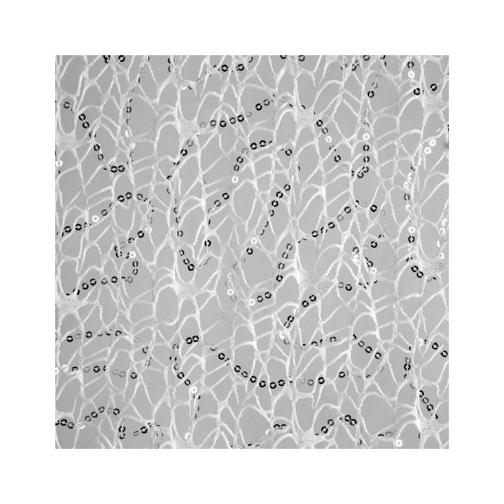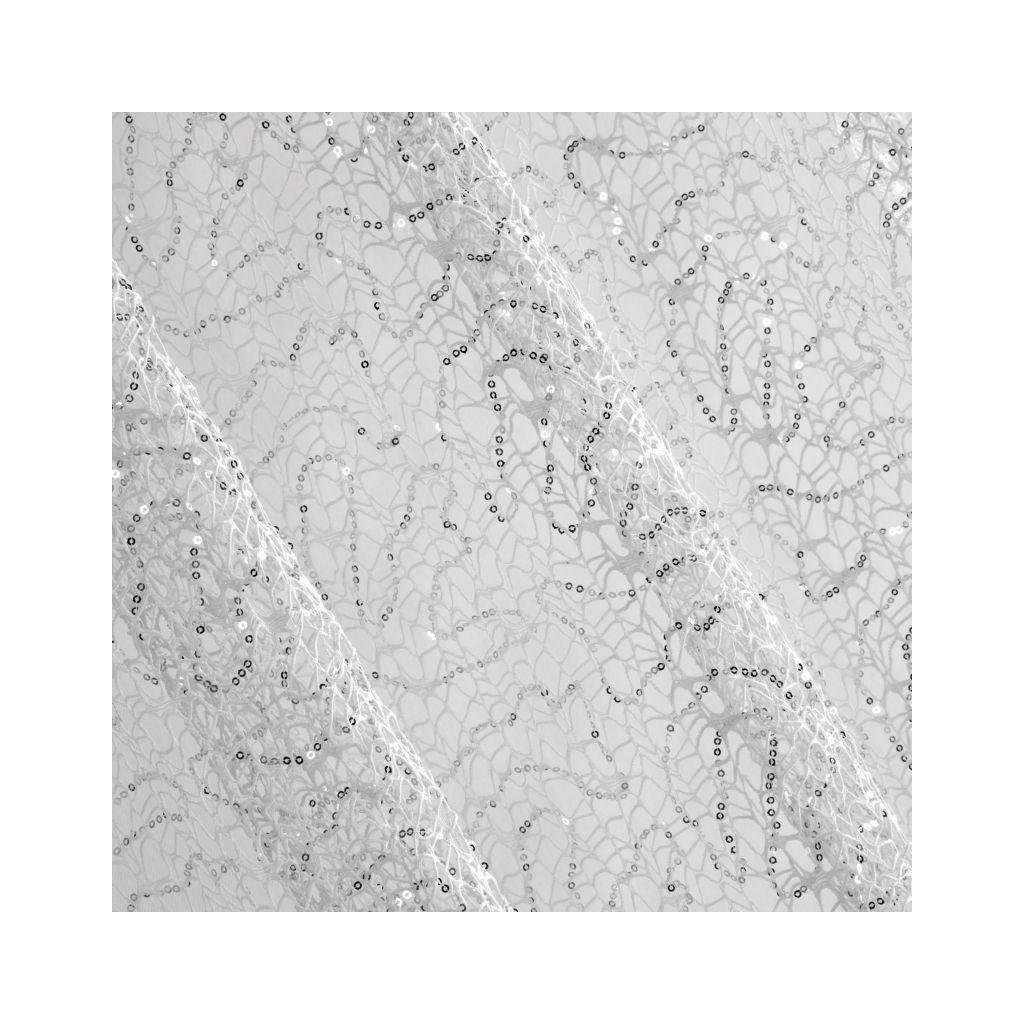 Jemná, biela záclona s nepravidelnou pavučinovou textúrou, zdobená striebornými flitrami. Ideálna pre pôvabné interiéry a moderné aranžmány.