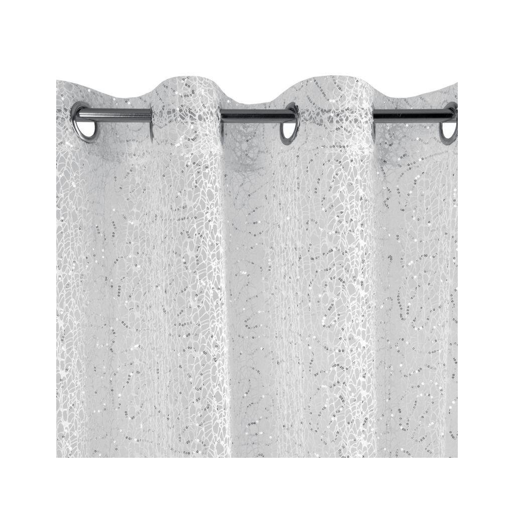 Dajte svojmu interiéru vyniknúť a rozžiarte ho! Záclony PASSIONATA zapôsobia svojim pôvabom. Nepravidelný vzor pavučiny snehobielej farby je ozdobený husto šitými lesklými trblietavými flitrami, ktoré zvýrazňujú eleganciu záclony. Táto dekorácia dodáva interiéru ľahkosť a nezvyčajnú krásu. Je vyrobená z vysoko kvalitných materiálov. Môžete ju ľahko pripevniť pomocou ozdobných krúžkov, ktoré zároveň vytvoria na látke jemné a pravidelné vlny. Perfektná voľba pre nadšencov romantického štýlu.