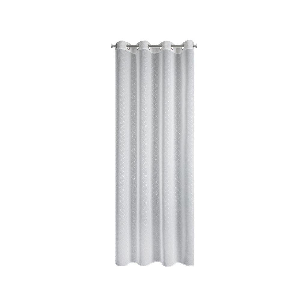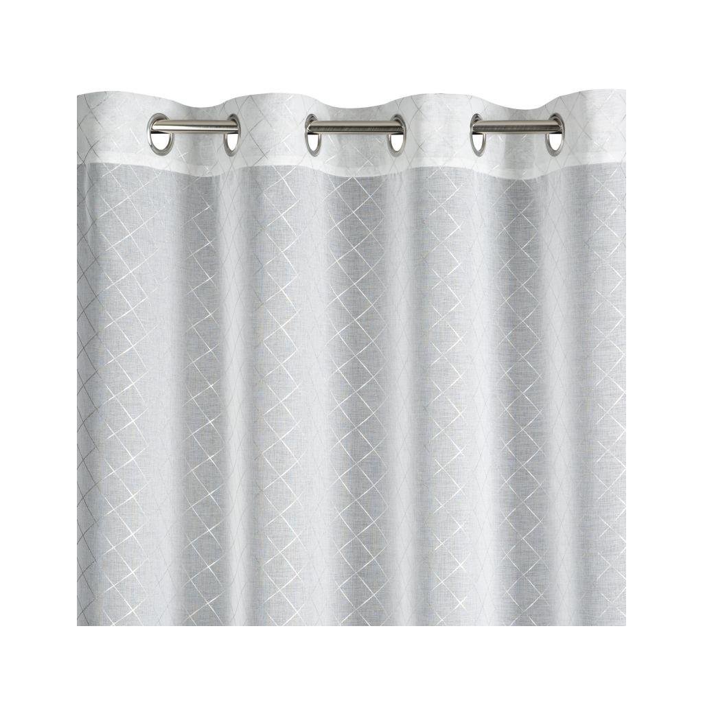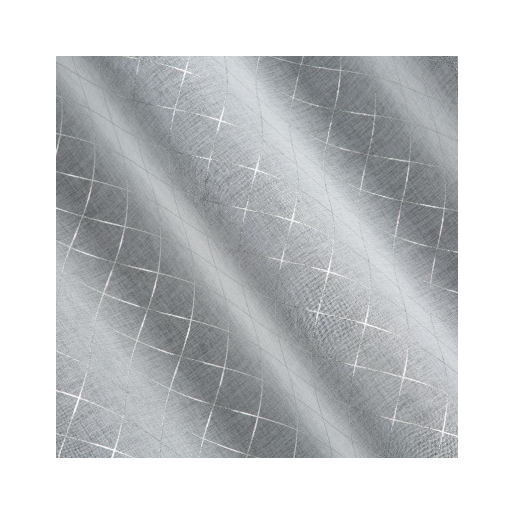 Svetlosivá záclona zdobená na celej ploche moderným strieborným geometrickým vzorom. Záclona z ľahkej matnej látky jemne zakrýva okno, obmedzuje prebytok slnečného žiarenia, preto ju odporúčame najmä do slnečných interiérov. Vďaka praktickým krúžkom je záclona usporiadaná do jemných a pravidelných vĺn a výmena záclony trvá iba chvíľu. Bude dokonale ladiť s oknom vo vašej spálni, jedálni alebo obývacej izbe.