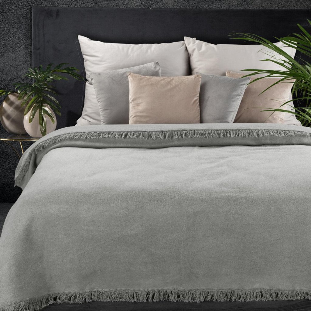 Elegantná a hebká jednofarebná strieborná deka so strapcami AKRYL vyrobená z bavlny a akrylu. Šírka: 150 cm, dĺžka: 200 cm, farba: strieborná, gramáž: 460 g/m2, zloženie: 58% bavlna, 32% akryl, 10% polyester