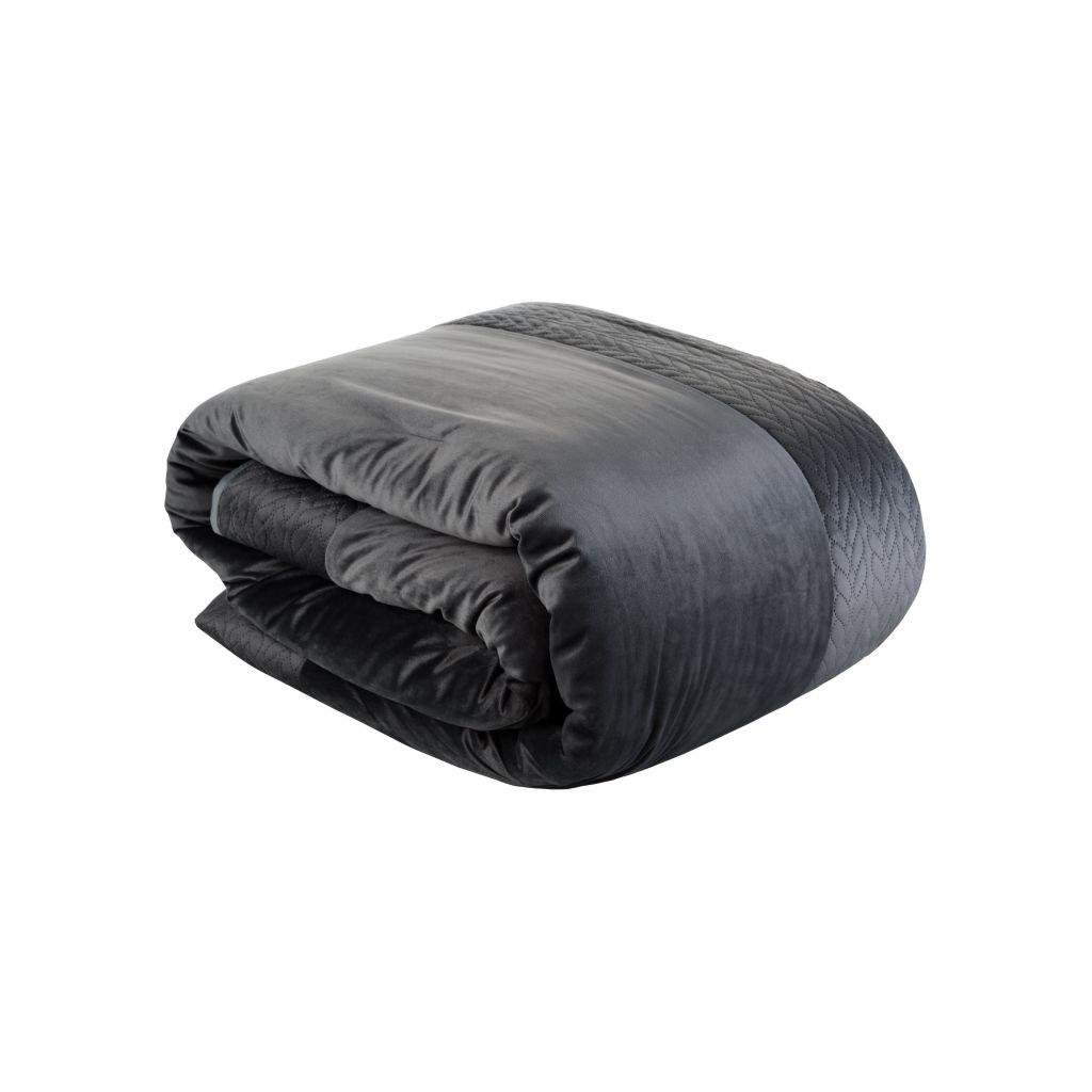 Elegantná posteľná prikrývka vyrobená z hladkej látky so zamatovým nádychom v odtieni módnej šedej je mimoriadne elegantným doplnkom vašej spálne. Posteľná prikrývka sa vyznačuje lesklým a na dotyk mäkkým povrchom, vznešenou zamatovou tkaninou, ktorej okraje sú upravené estetickým zamatovým okrajom s vyrazeným geometrickým vzorom. Takýto doplnok dokonale podčiarkuje kúzlo vašej spálne.