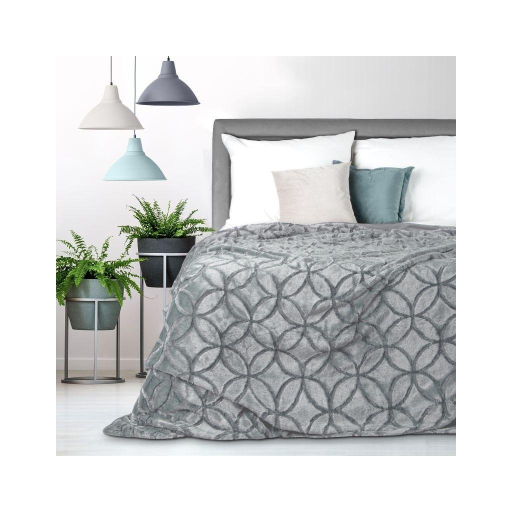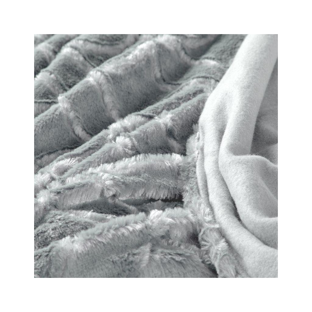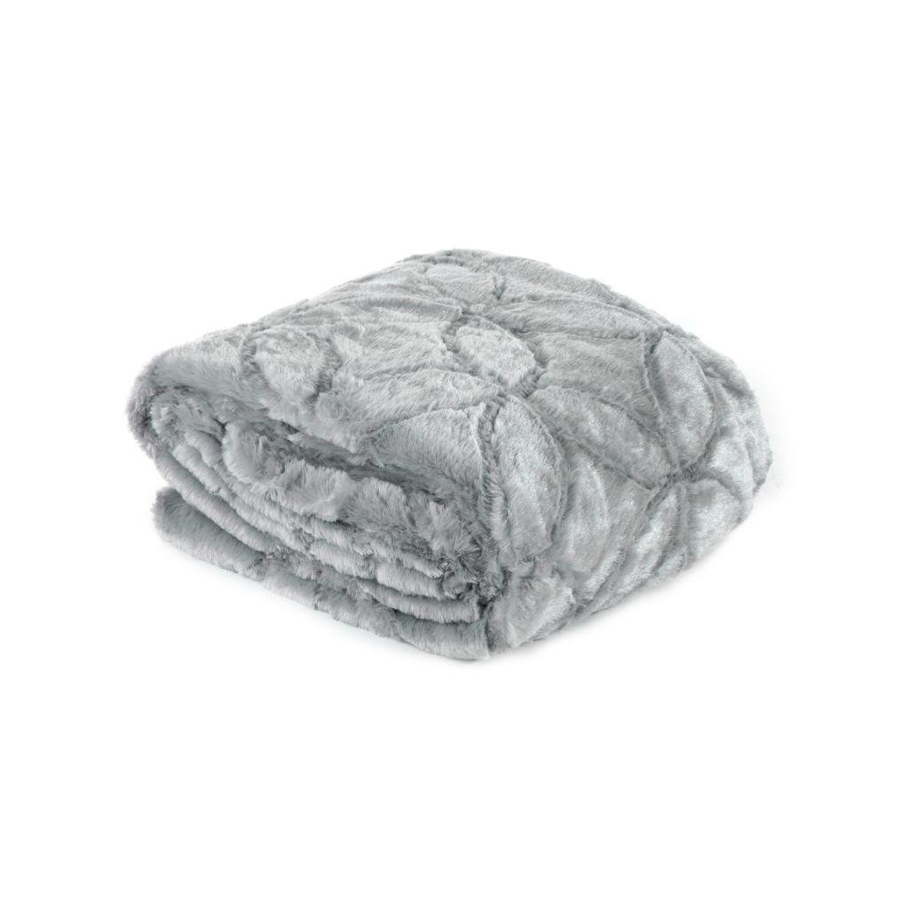 Príjemná posteľná prikrývka striebornej farby s jemnou kožušinovou štruktúrou. Povrch je vtlačený do geometrického vzoru prekrížených kruhov. Spodok je lemovaný hladkým flanelom. Môže slúžiť aj ako teplá deka. 70x160 cm.